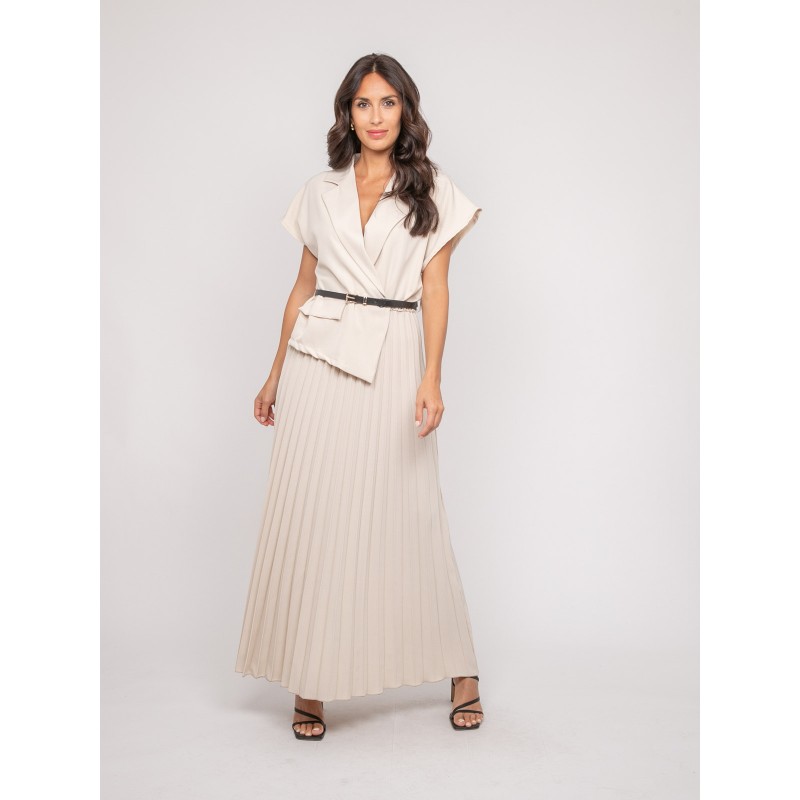 Cette robe longue allie élégance structurée et fluidité pour une silhouette moderne et féminine. Son haut façon blazer croisé apporte une allure sophistiquée, tandis que la jupe plissée offre un tombé aérien et élégant, idéal du quotidien aux occasions plus habillées.