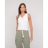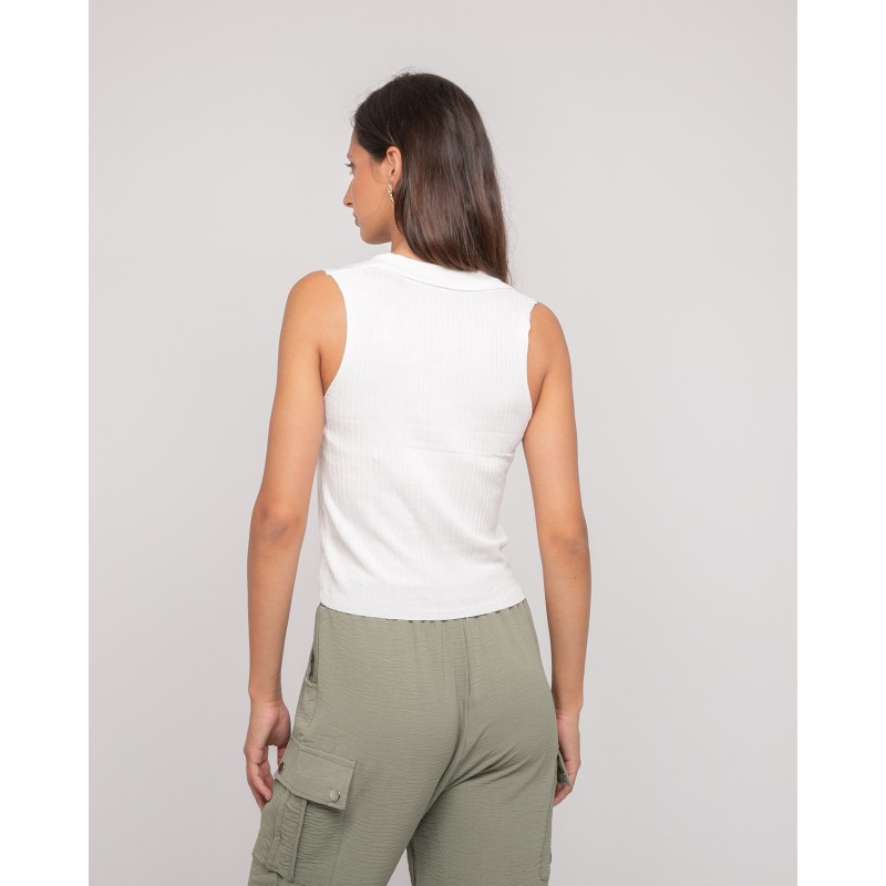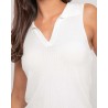 Ce top sans manches séduit par sa maille côtelée et sa coupe près du corps, idéale pour structurer la silhouette avec élégance. Son encolure façon polo apporte une touche chic et moderne, facile à porter au quotidien comme en tenue plus habillée.