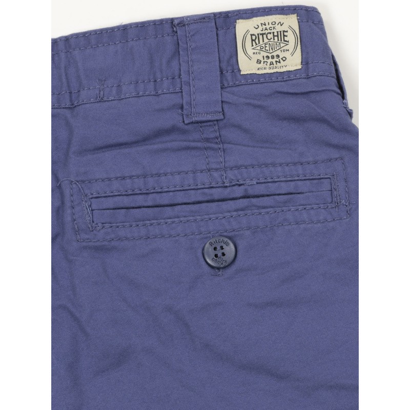 Bermuda chino en pur coton. Fermeture par zip et bouton ton sur ton à la taille. Ceinture à passants. 2 poches cotés et 1 poche ticket devant. 2 poches passepoilées boutonnées au dos. 100% coton. Lavage en machine à 30°.