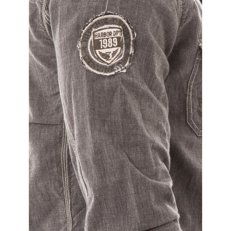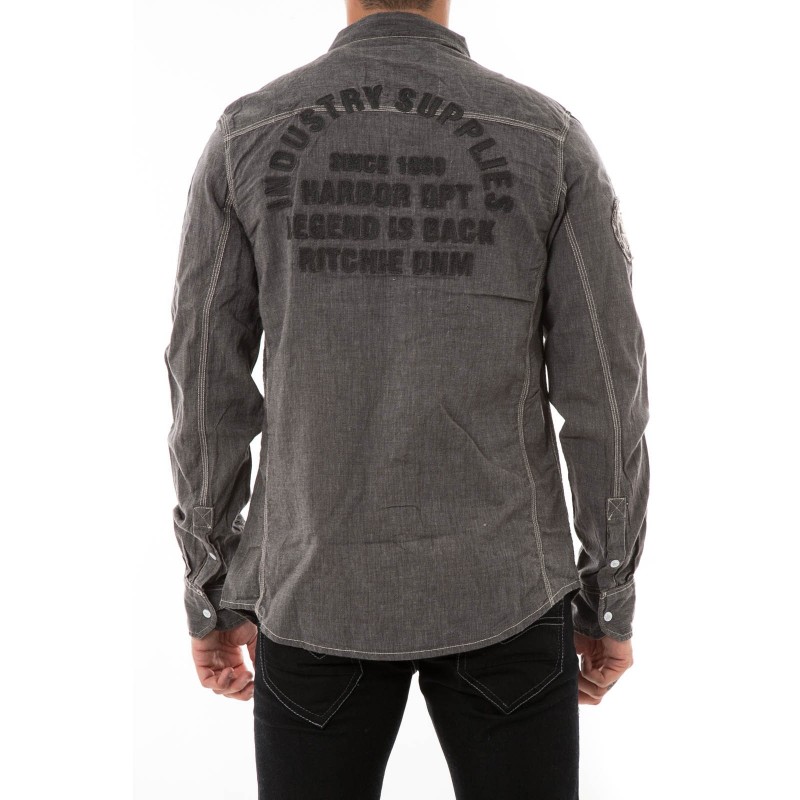 Chemise manches longues en coton "esprit denim". Fermeture par boutons pressions. 2 poches plaquées à rabats pressionnés avec broderie RJ sur la poche droite. Etiquette en simili cuir cousue au dessus de la poche gauche. Ecusson Ritchie brodé sur la manche droite. Lettrage signé Ritchie brodé dans le dos Industry Supplies since 1989 Harbor Dpt. Legend is back. Empiècement épaules et surpiqûres apparentes. Base arrondie. 100% coton. Lavage en machine à 30°.