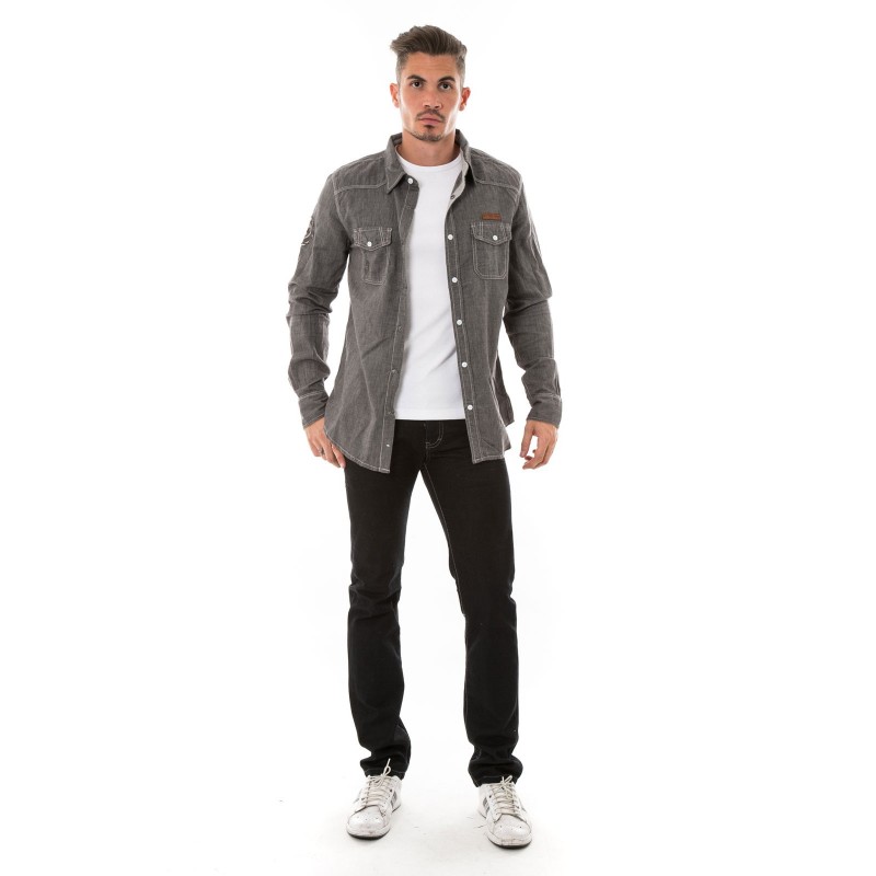 Chemise manches longues en coton "esprit denim". Fermeture par boutons pressions. 2 poches plaquées à rabats pressionnés avec broderie RJ sur la poche droite. Etiquette en simili cuir cousue au dessus de la poche gauche. Ecusson Ritchie brodé sur... En savoir plus >