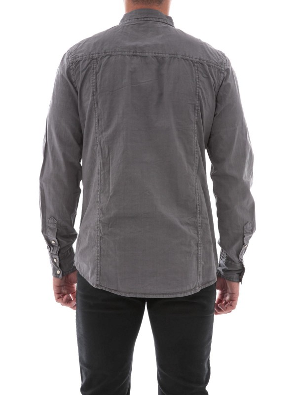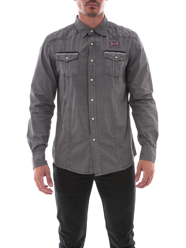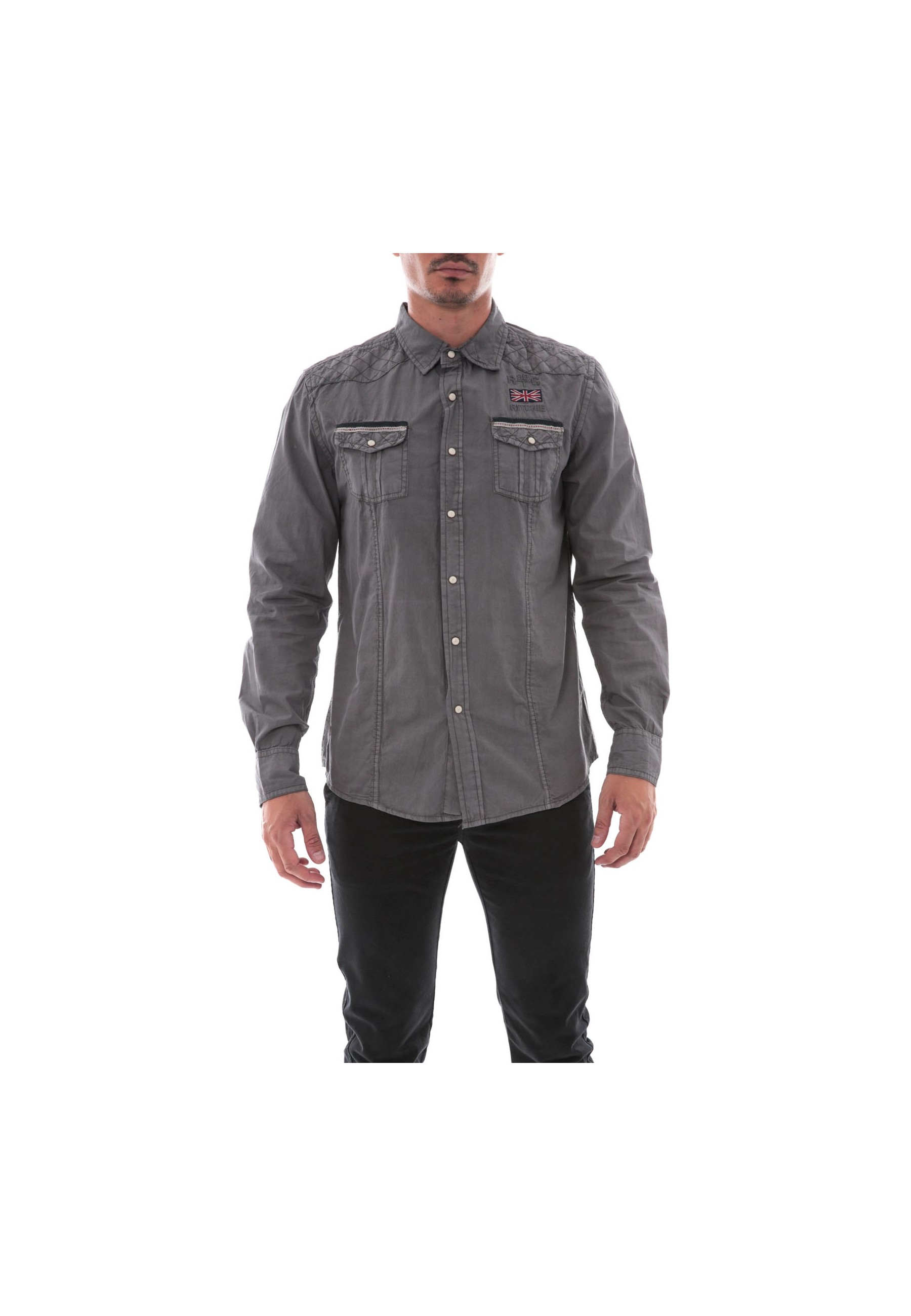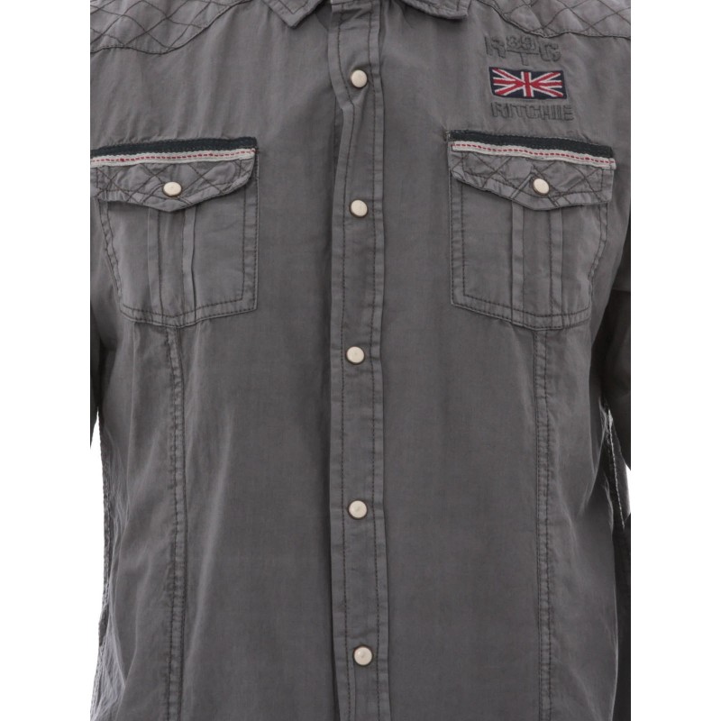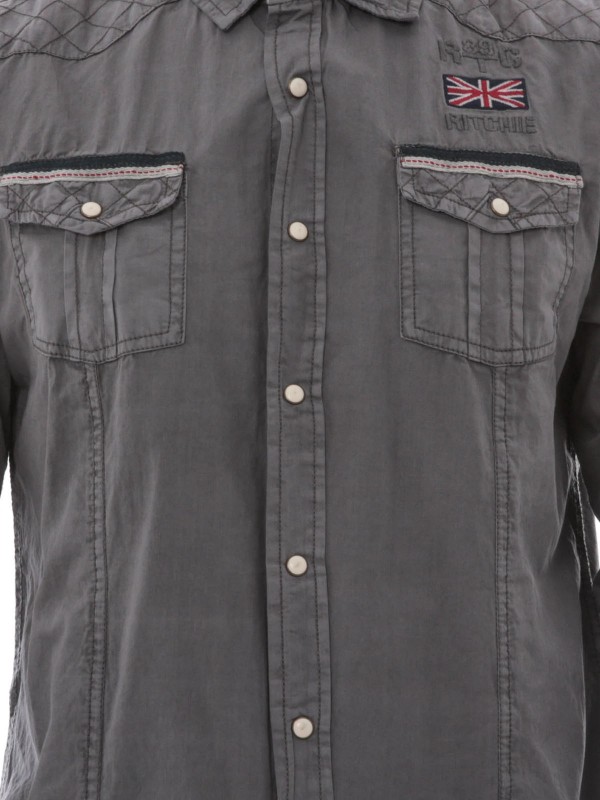 Chemise unie "esprit vintage". Fermeture par boutons pressions. Col à pointes libres. 2 poches plaquées à rabats pressionnés. Empiècement épaules. Ecusson du drapeau anglais brodé au dessus poche gauche. Base arrondie. 100% coton. Lavage en machine à 30° conseillé.