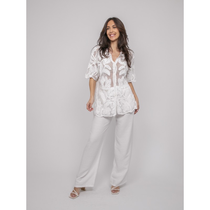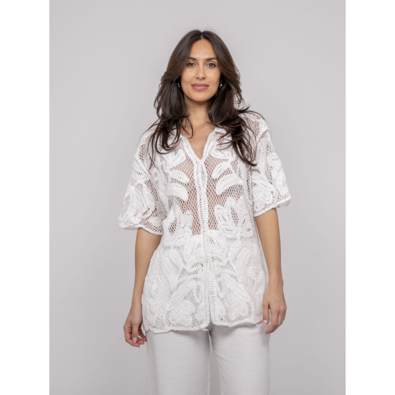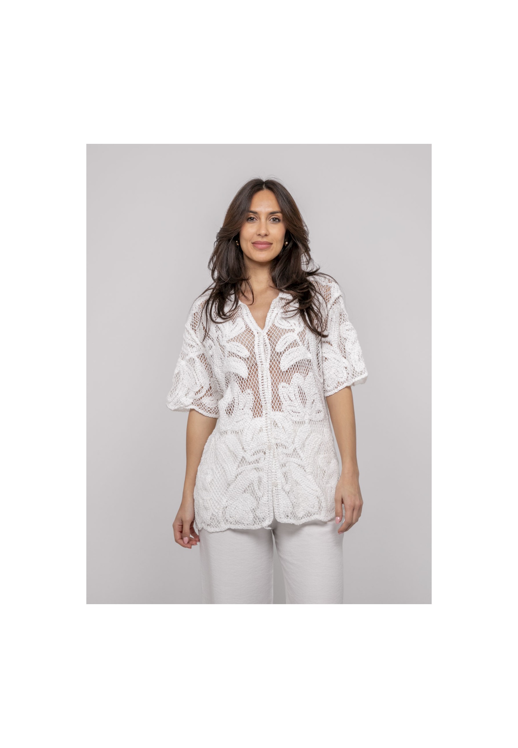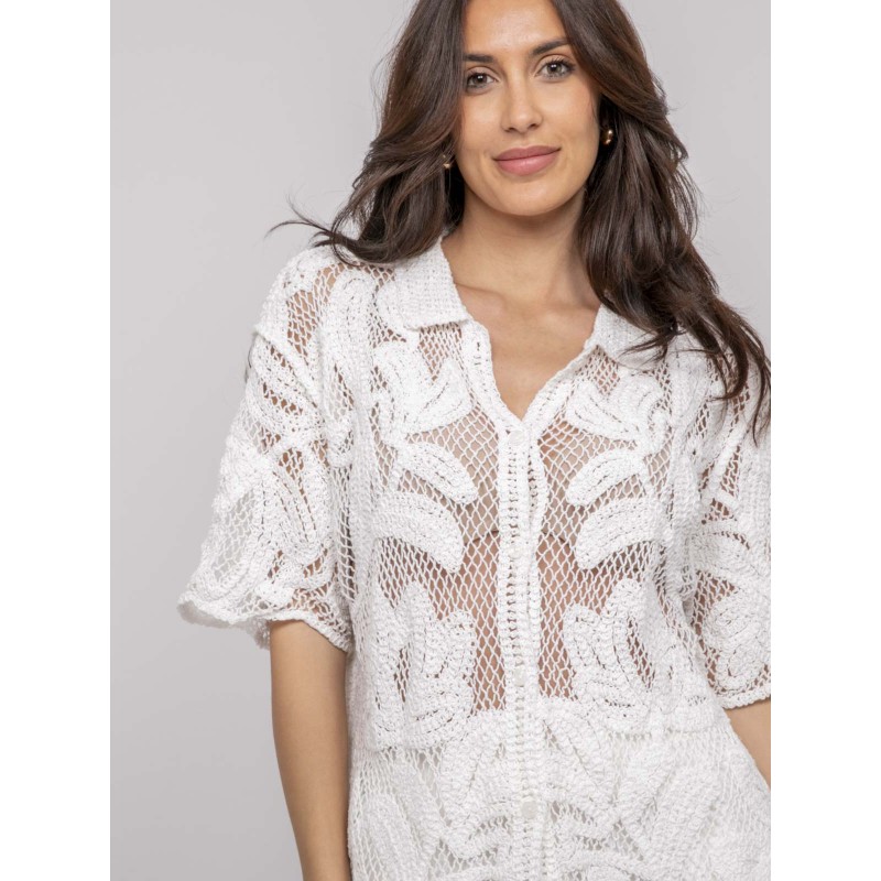 Léger et raffiné, ce chemisier en maille d'été ajourée offre un jeu de transparence délicat pour une allure chic et estivale. Son motif en relief et sa coupe fluide en font une pièce idéale pour la saison. Parfait pour superposer sur un top ajusté ou en sortie de plage, il apporte une touche d’élégance bohème à toutes vos tenues.