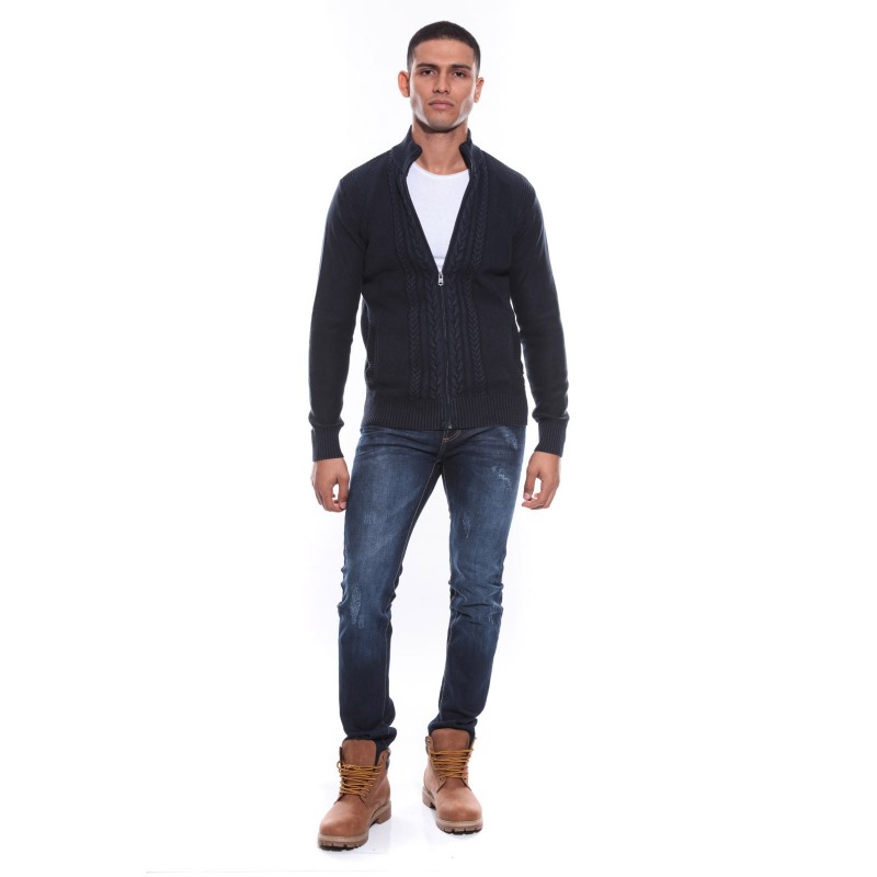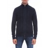 Gilet col montant zippé mailles torsadées. Plaque métallique brodée sur le bas. Finitions bords côtes. 100% coton. Lavage en machine à 30°.