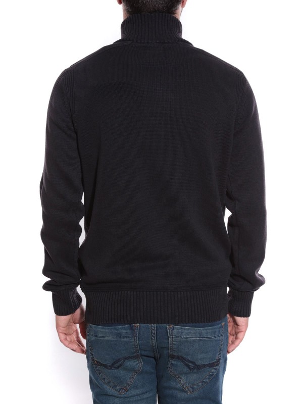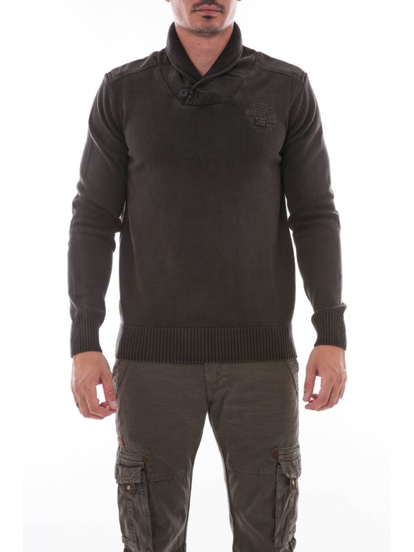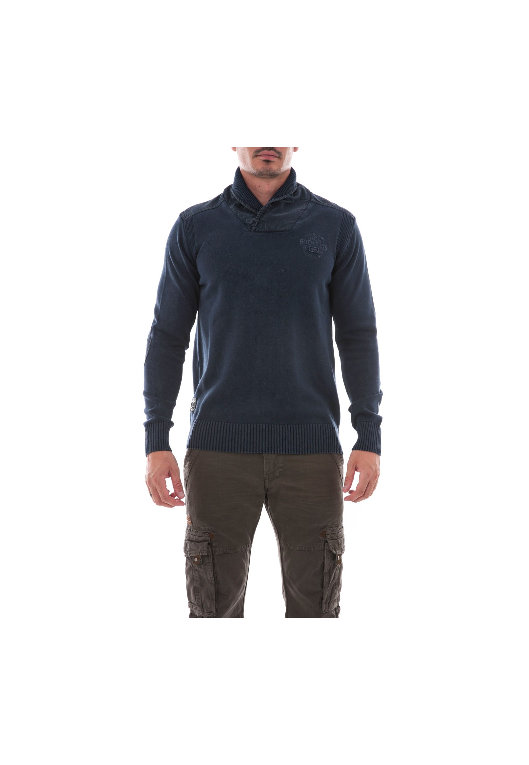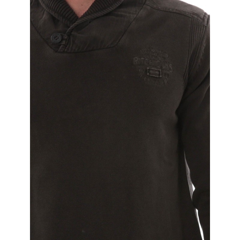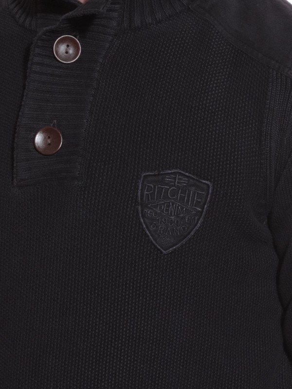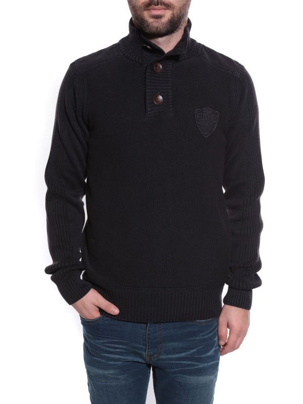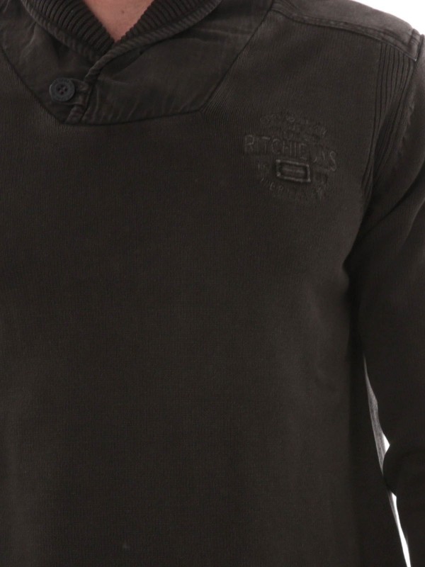 Pull col chale en pur coton. Mélange ton sur ton de mailles fines, mailles bords cotes et tissu au col, aux épaulettes et aux coudières. Broderie ton sur ton Ritchie sur poitrine. Finitions bords cotes. 100% coton. Lavage en machine à 30°.