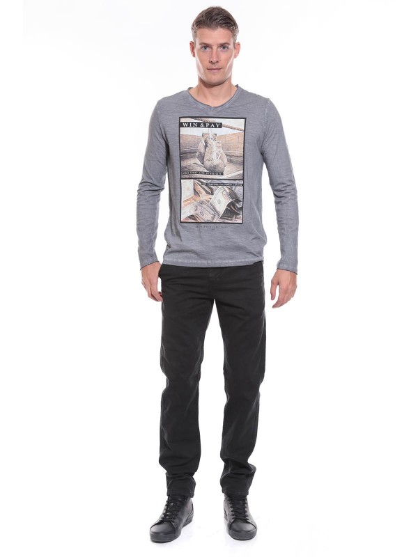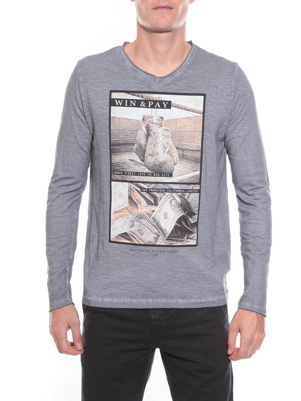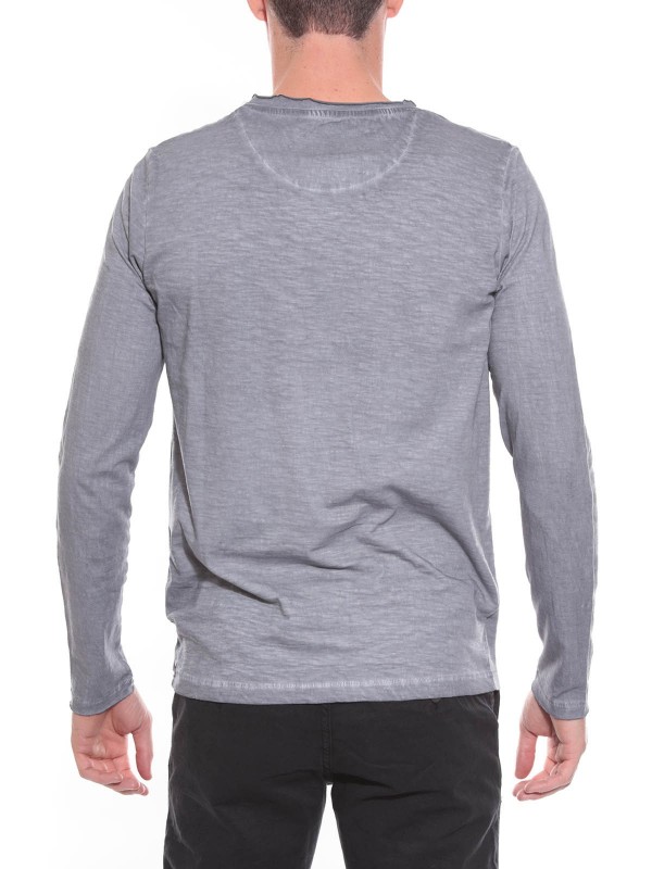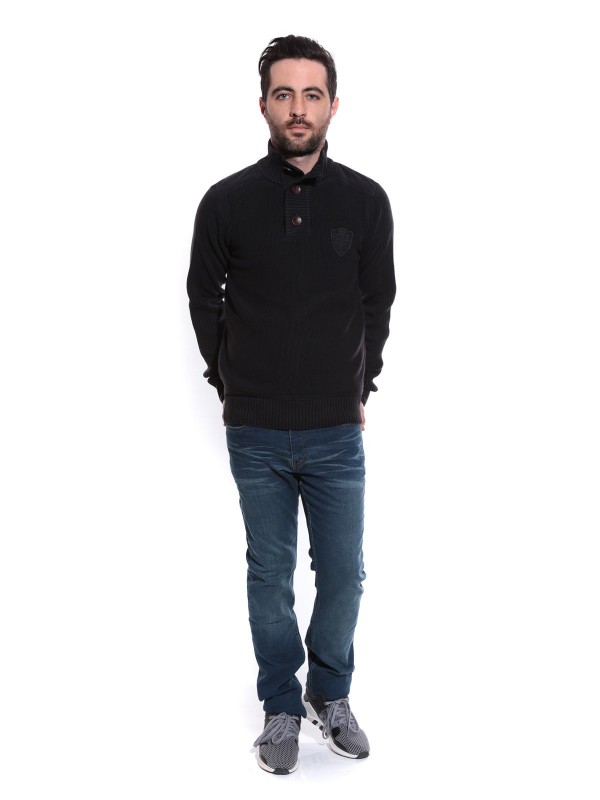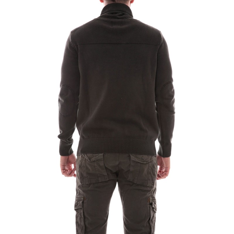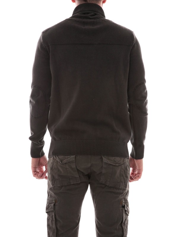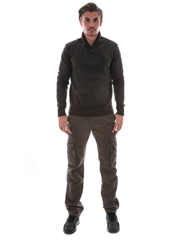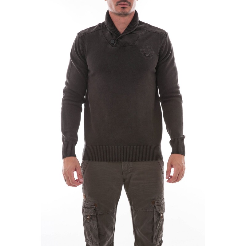 Pull col chale en pur coton. Mélange ton sur ton de mailles fines, mailles bords cotes et tissu au col, aux épaulettes et aux coudières. Broderie ton sur ton Ritchie sur poitrine. Finitions bords cotes. 100% coton. Lavage en machine à 30°.