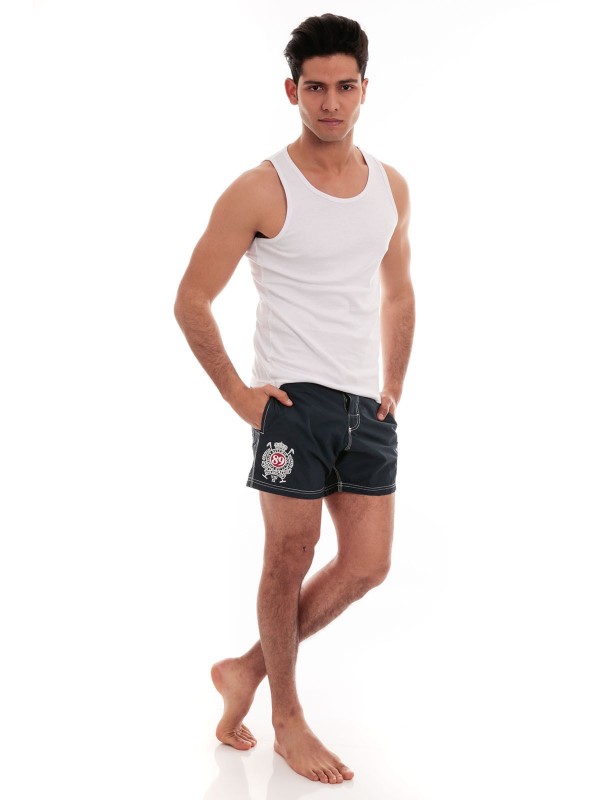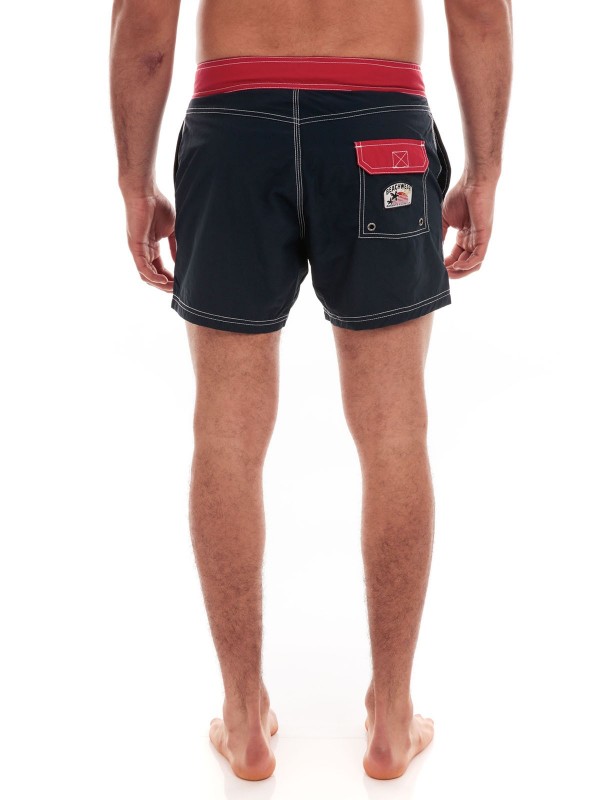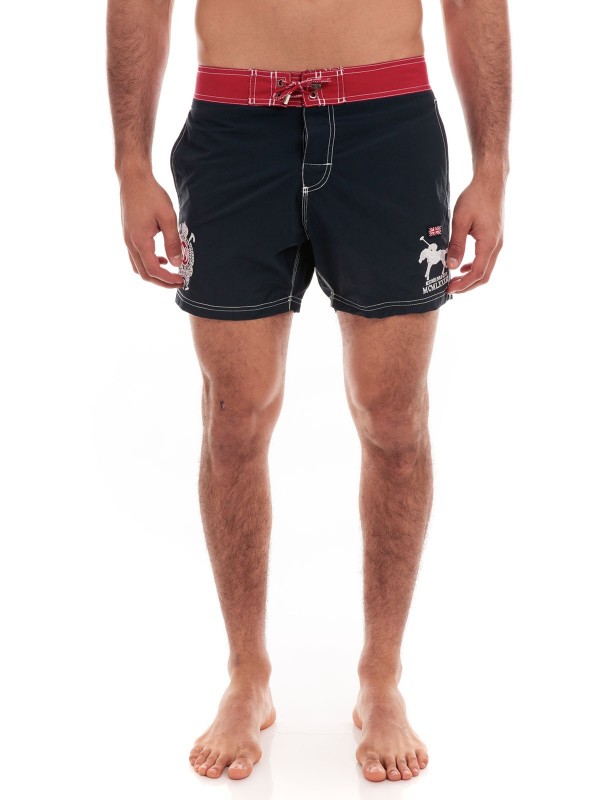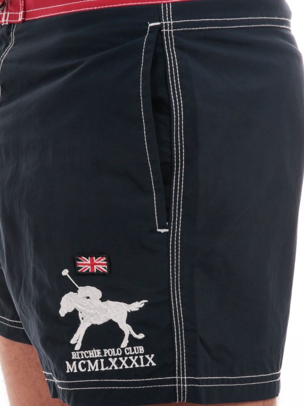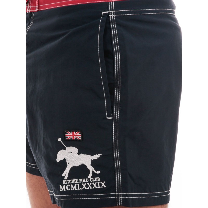 Short de bain à ceinture plate "esprit boardshort". Braguette auto-agrippante et lien de serrage extérieur. Slip intérieur en maille filet. 2 poches ouvertes devant et 1 poche arrière plaquée avec rabat à fermeture scratch et rivets de vidange. Surpiqûres apparentes et contrastantes. Broderie blason Ritchie Polo Club sur jambe gauche et joueur de polo et drapeau anglais sur jambe droite. Etiquette siglée Ritchie Beachwear cousue sur poche arrière. 100% polyamide. Lavage en machine à 30°.