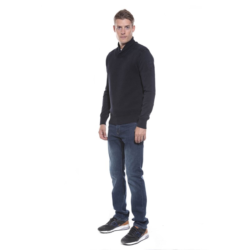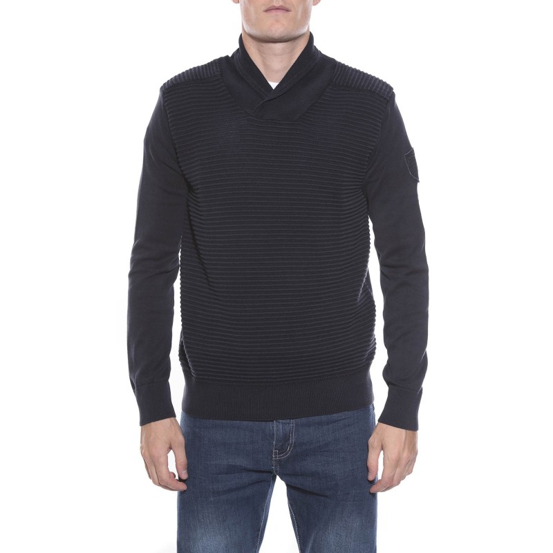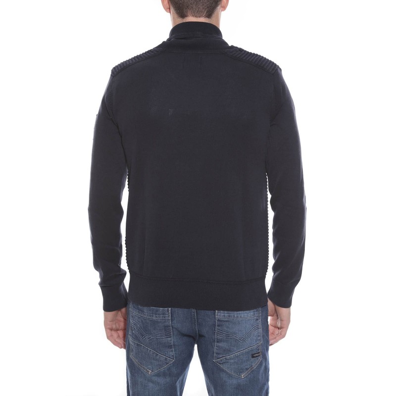 Pull col châle uni, pur coton. Joli mélange de mailles avec effet raglan. Ecusson siglé Ritchie sur manche gauche. Finitions bords côtes. 100% coton. Lavage en machine à 30°.