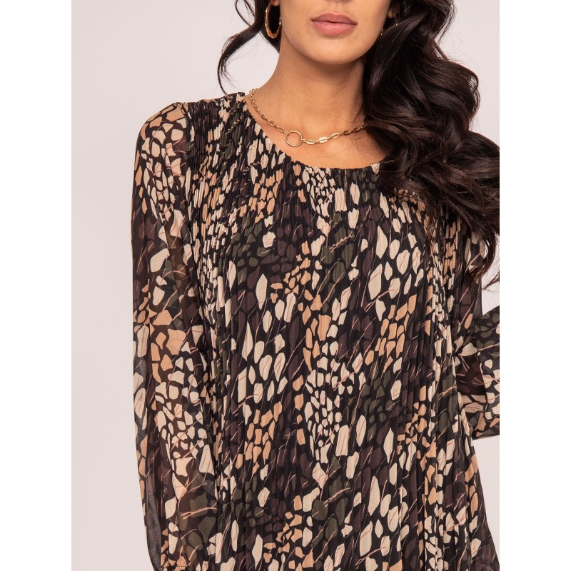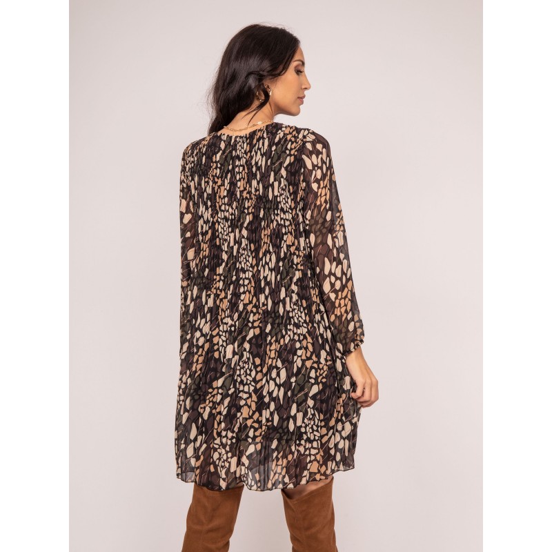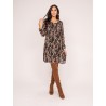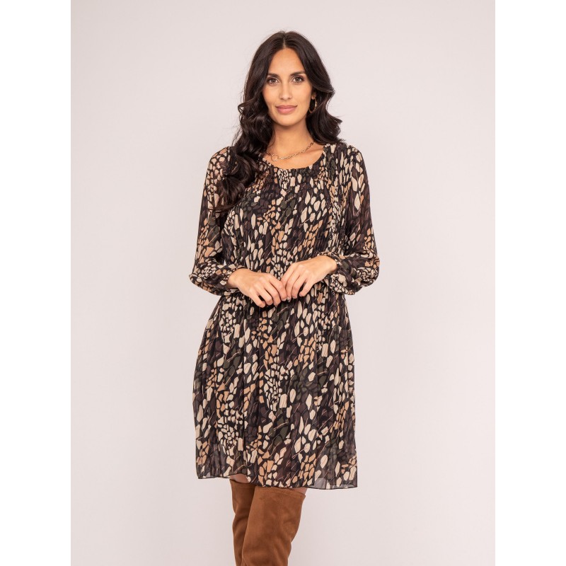 Cette robe courte Dona Lisa se présente dans un coloris sombre et raffiné, idéal pour l'été, comme pour la demi-saison ou l'hiver. Sa texture fluide lui confère un mouvement élégant, souligné par son jeu de plis sur le devant. Doté de manches longues semi-transparentes, le modèle s'agrémente d'un motif sur l'ensemble pour une touche de contraste. Enfilez cette robe légère en toute simplicité, avec une veste de blazer et des escarpins.