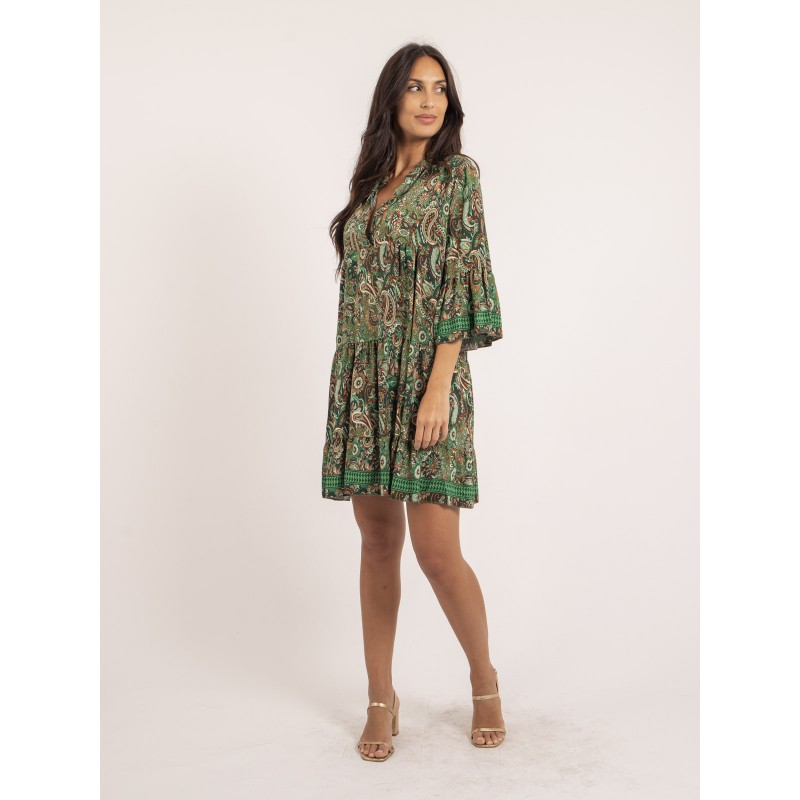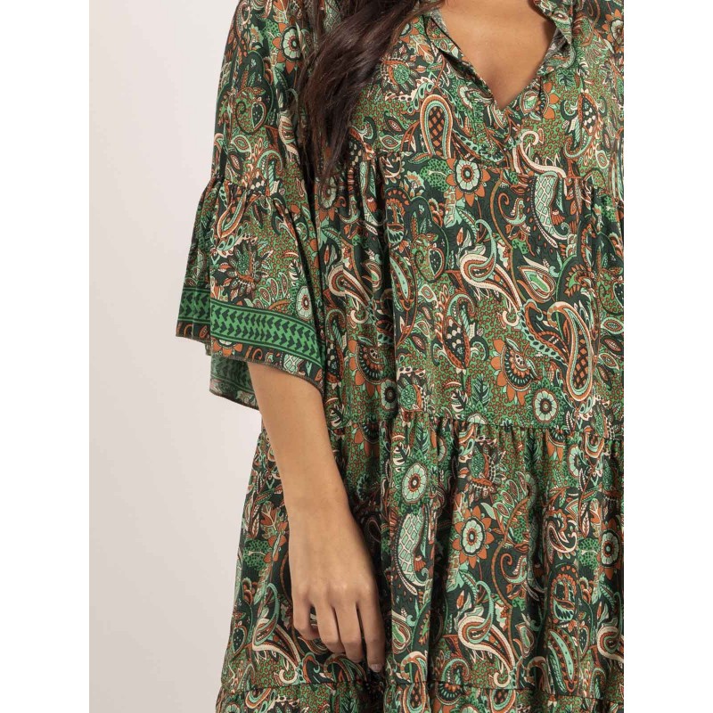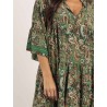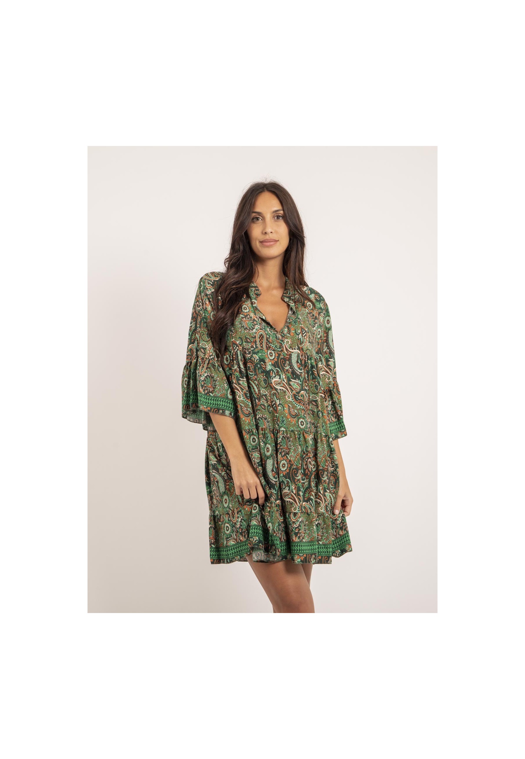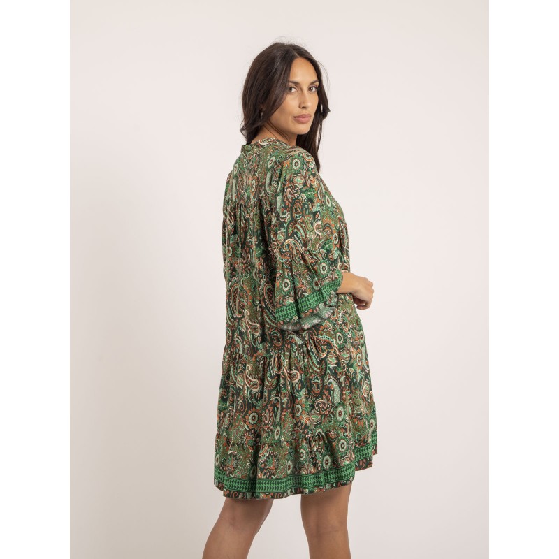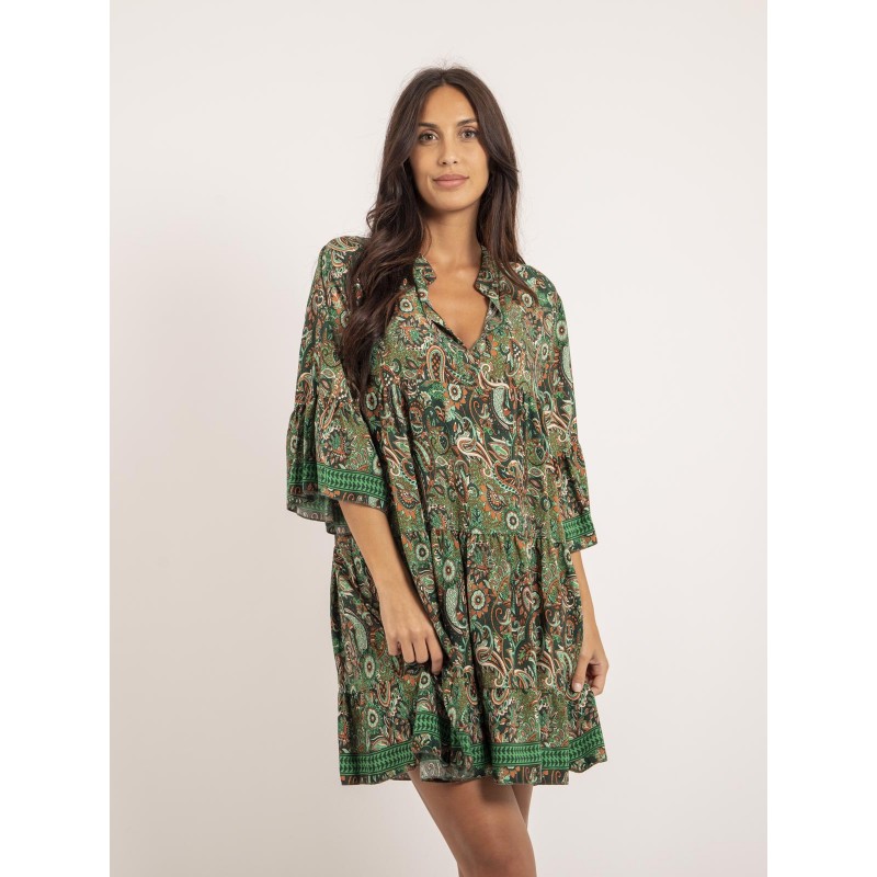 Avec cette robe courte imprimée, Dona Lisa revisite le caftan traditionnel avec beaucoup de style et de féminité. Notre Maison joue sur les contrastes avec un motif cachemire en all-over. Mis en valeur par un col en pointe, le modèle sera parfait associé à une paire de sandales.