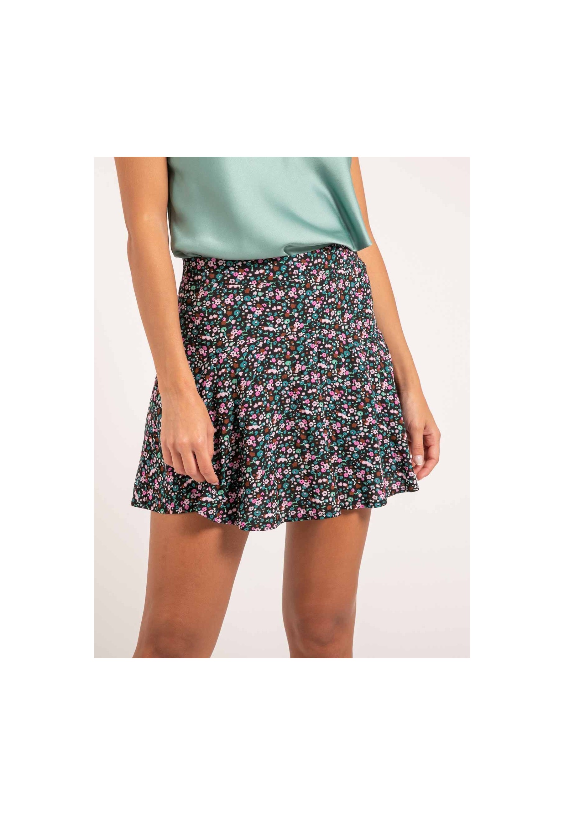 Cette jupe short habillée Dona Lisa fait la différence avec une palette de couleurs contemporaines, idéale pour se distinguer. Elle se présente dans un coloris sombre rehaussé d'un petit imprimé floral contrasté all-over. L'esprit raffiné du modèle est souligné par sa matière en viscose fluide, qui donne un mouvement élégant à la démarche. Vous pourrez twister cette jupe courte avec un pull fin ample et une paire de richelieus à sandales.