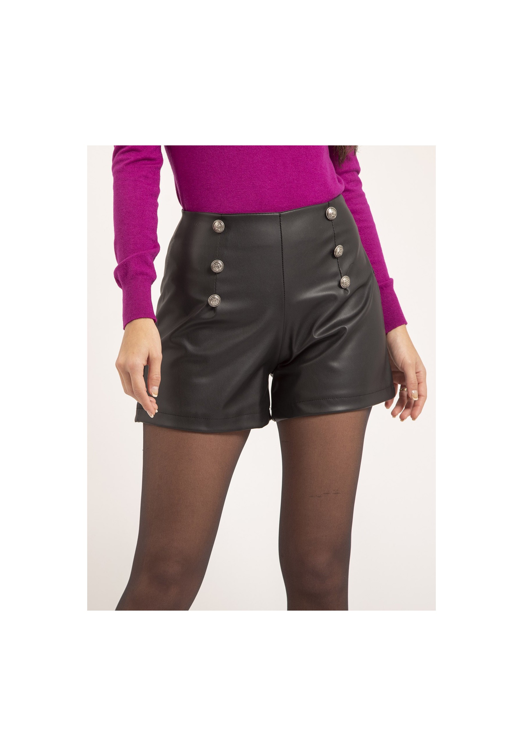 Avec ce short en similicuir, Dona Lisa transpose une pièce estivale à l'hiver et à la mi-saison. Il est décliné dans une version courte avec deux rangées de boutons décoratifs sur l'avant, esprit marin, et une taille haute. Affirmez votre style en harmonisant ce short pour femme avec un pull de notre collection et une paire de mocassins à bout rond.