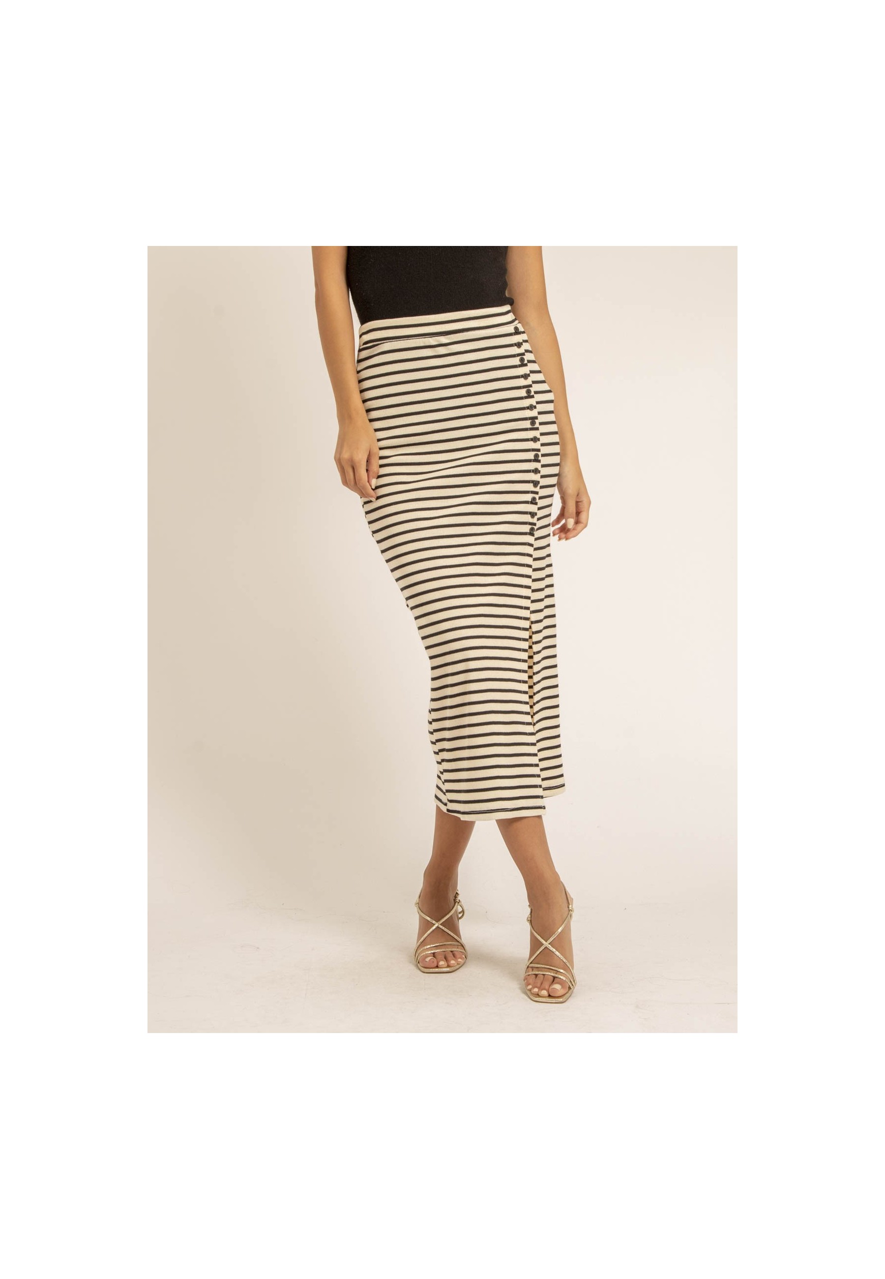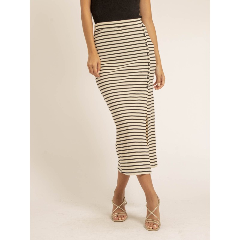 Détails produit Longueur: maxi Taille haute élastiquée Fente sur le côté Petits boutons décoratifs le long de la jambe Coupe moulante Motifs rayures sur l'ensemble Composition et entretien 48% viscose, 24% coton, 24%... En savoir plus >