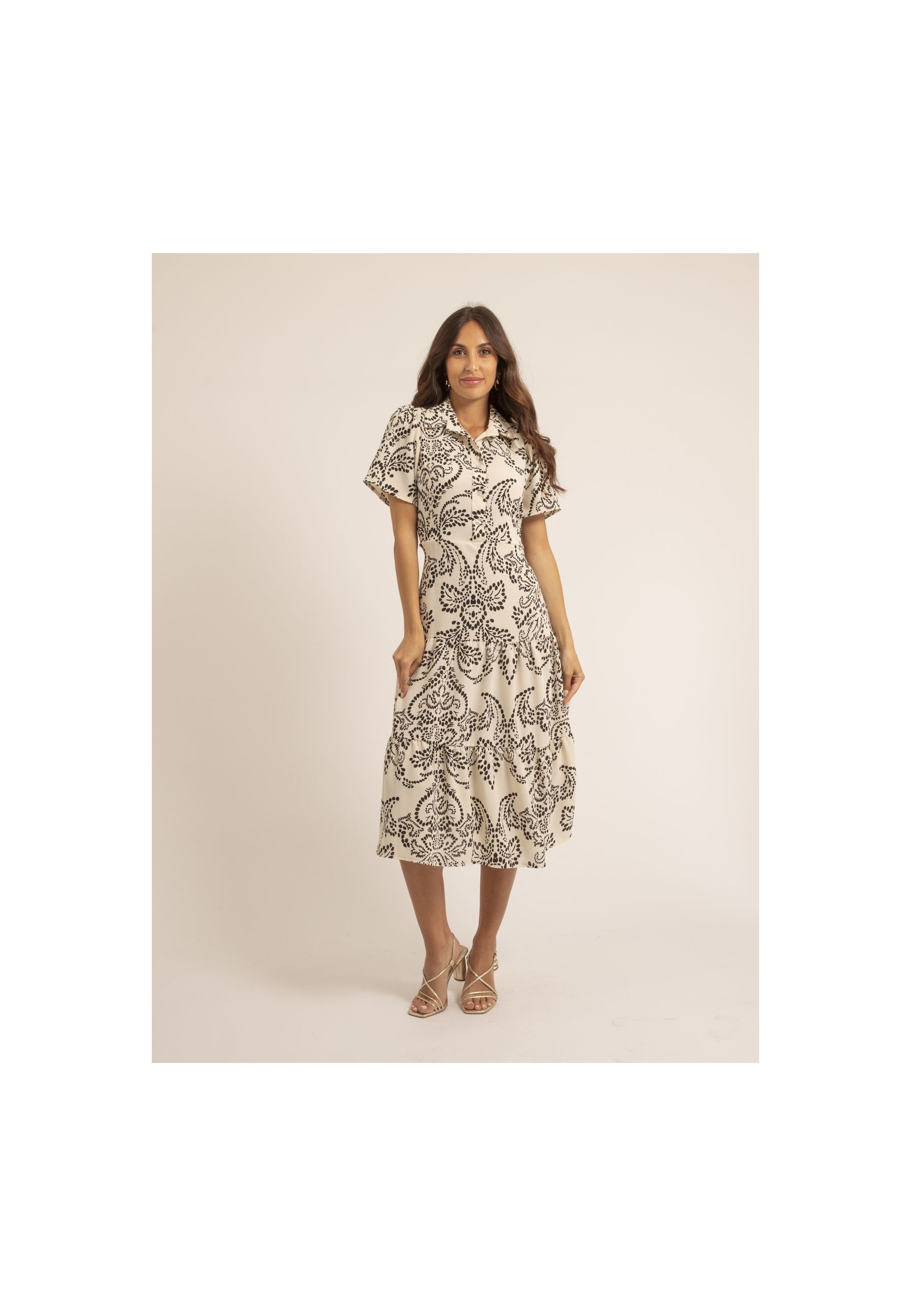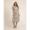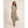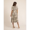 Cette robe midi Dona Lisa s'impose comme une version originale de la robe chemise. Soulignée par une rangée de petits boutons le long du devant, la pièce s'évase dans le bas et gagne en volume par des rangées de volants. Composez une tenue minimaliste en enfilant cette robe légère avec une paire de sandales.