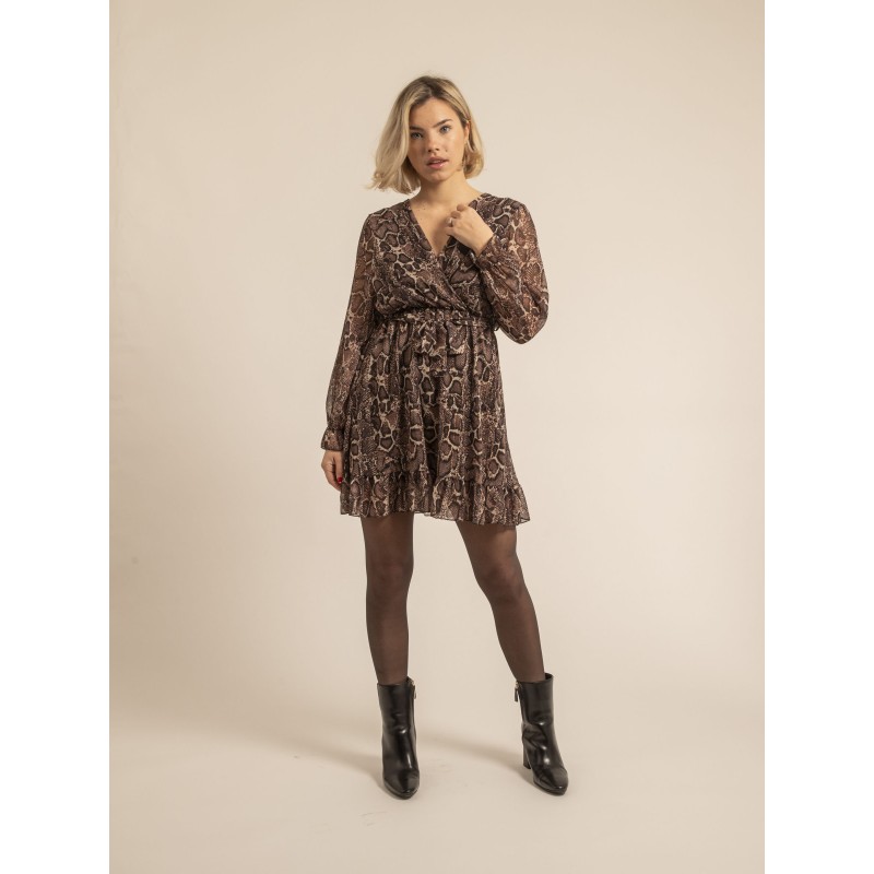 Laissez-vous séduire par cette robe courte Dona Lisa à motifs, parfaite pour les soirées d'hiver. Son imprimé serpent raffiné apporte une touche d'élégance sauvage, tandis que la coupe fluide assure un confort optimal. Idéale pour se démarquer en toute occasion.