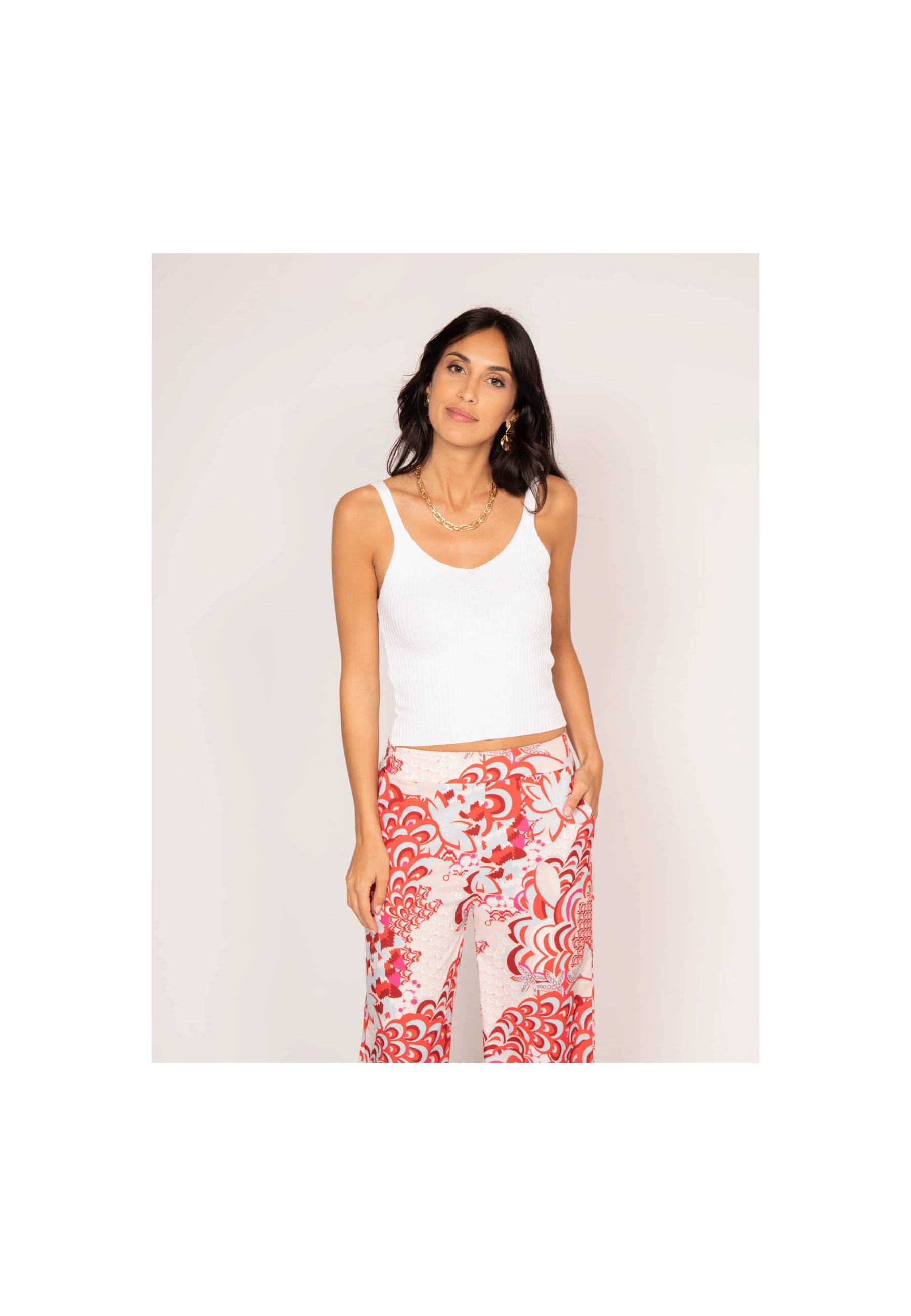 Ce débardeur Dona Lisa en maille et viscose est un indispensable du vestiaire féminin, qui s'intégrera parfaitement à vos looks du quotidien. Nous avons opté pour une matière douce à la texture confortable, avec des côtes ton sur ton sur l'ensemble. Ce modèle sans manches offre une allure raffinée grâce à la forme de ses emmanchures et de son col échancré. Adoptez une tenue d'inspiration streetwear en associant ce débardeur pour femme à un pantalon ample kaki et une paire de sneakers.