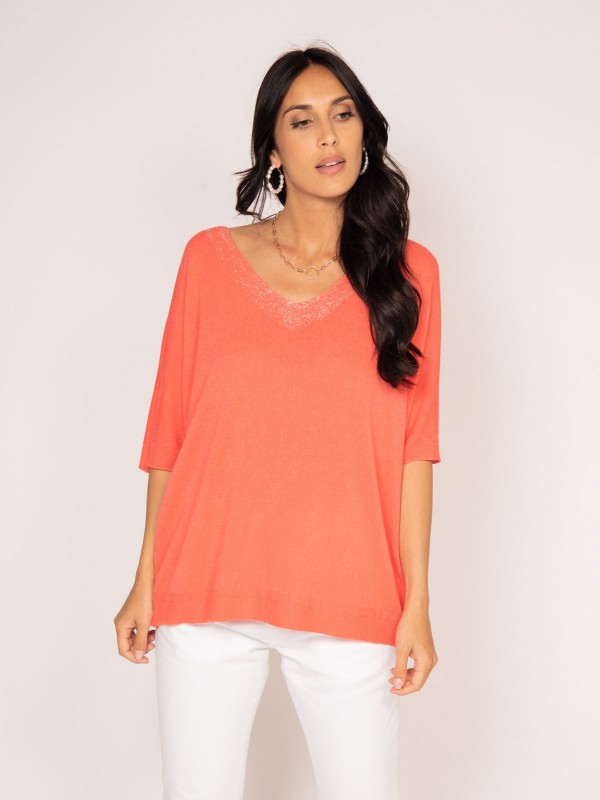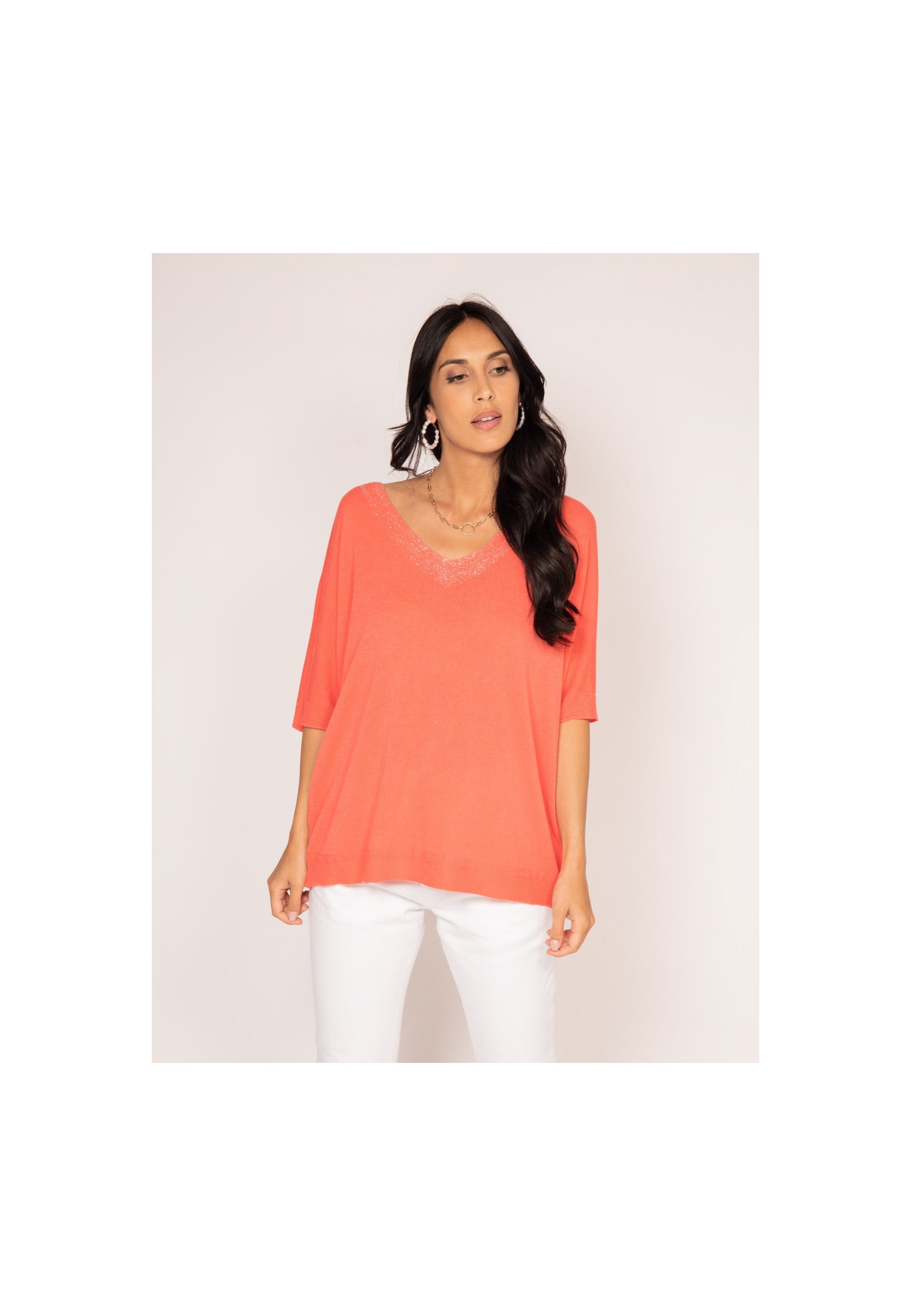 Dona Lisa revisite le pull d'hiver dans un esprit raffiné. La pièce s'adapte aux températures estivales à travers des manches 3/4, accompagnées d'un large col V décolleté. Vous pourrez enfiler ce pull long en toute simplicité avec un pantalon de ville ajusté et une paire de baskets.