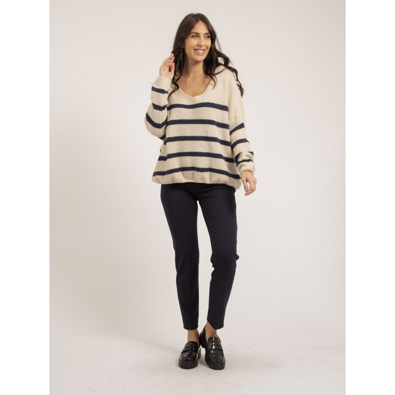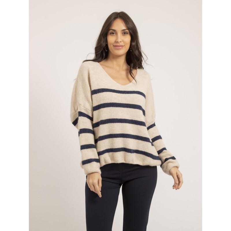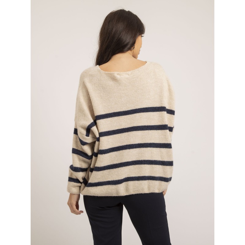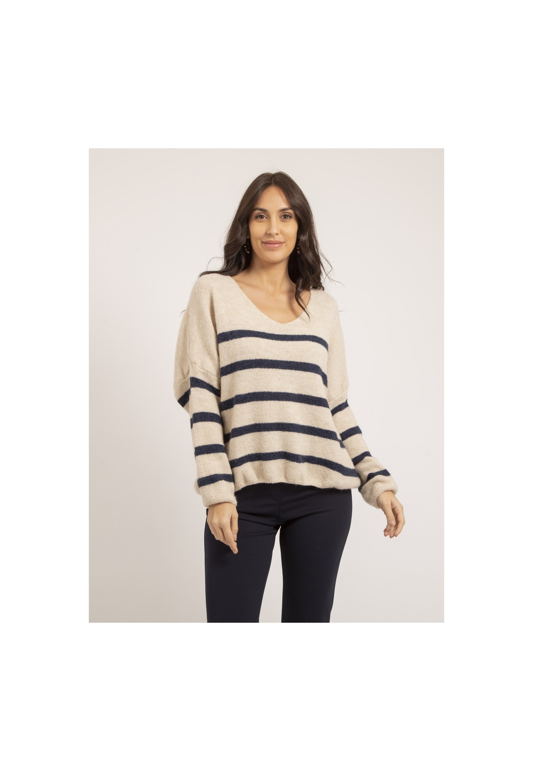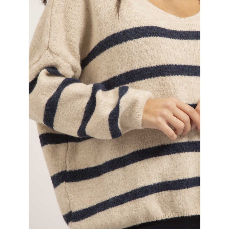 Détails produit Manches longues Large col V Motif rayé Coupe oversize Composition 44% acrylique, 24% nylon, 16% viscose, 16%laine Conseils taille Le mannequin mesure 172 cm et porte l'article en taille S/M