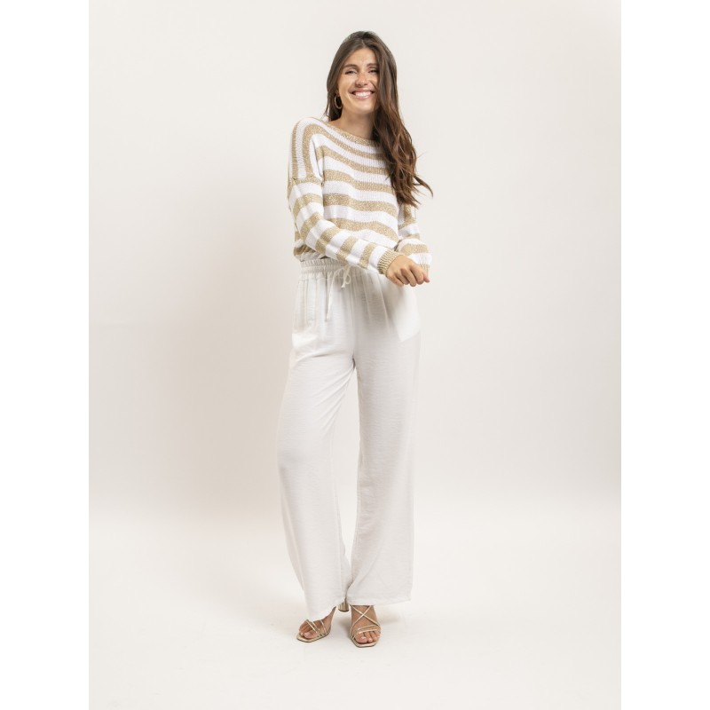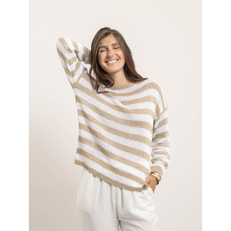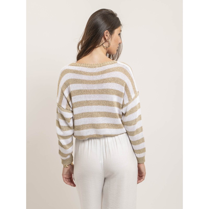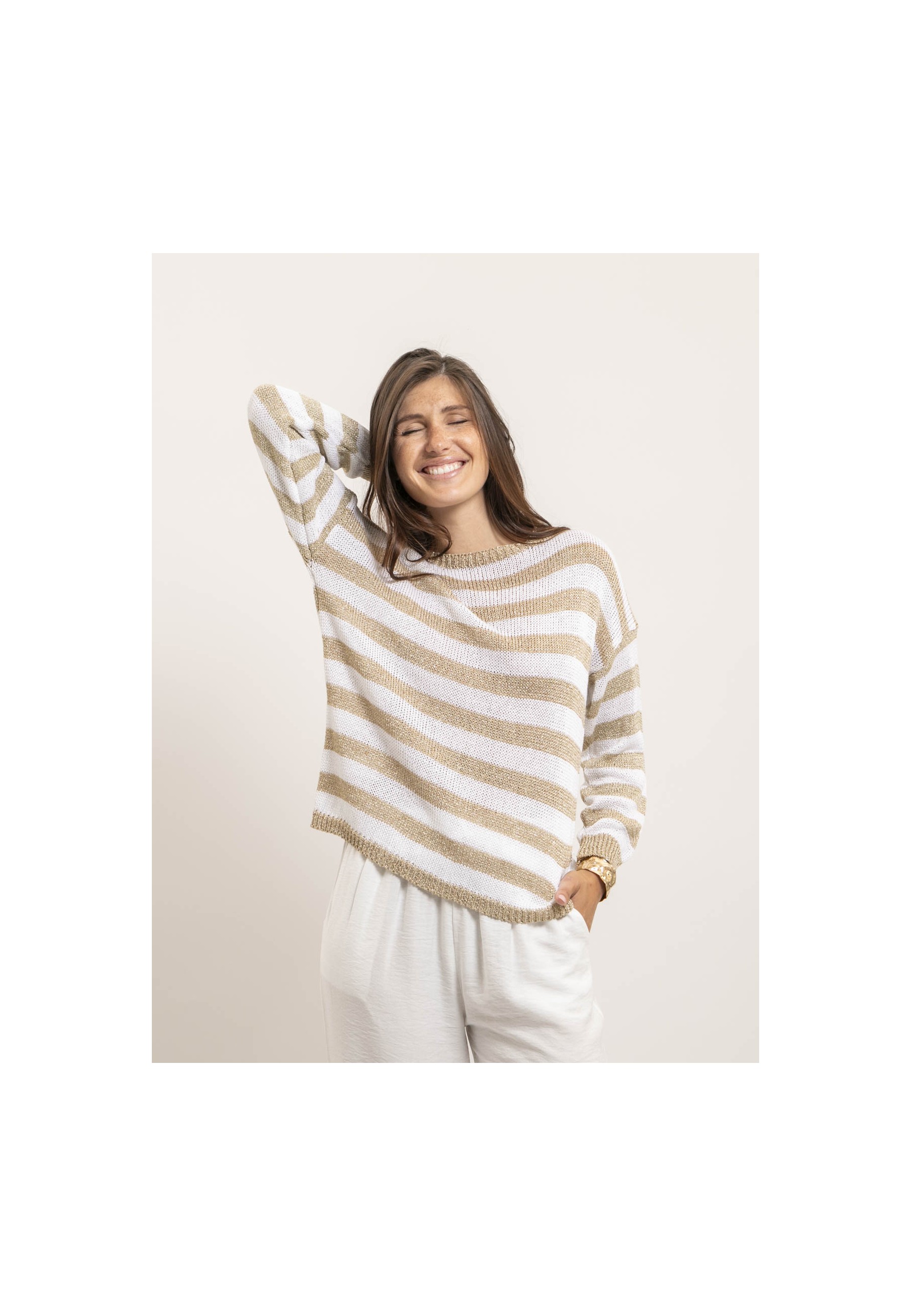 Ajoutez une touche lumineuse et légère à votre garde-robe avec ce pull doux et aéré. Conçu avec un style décontracté et des rayures scintillantes, il se porte parfaitement en demi-saison. Une pièce versatile qui allie confort et élégance décontractée.