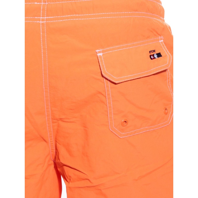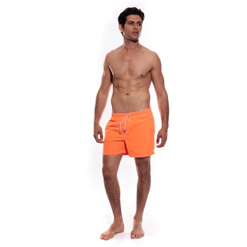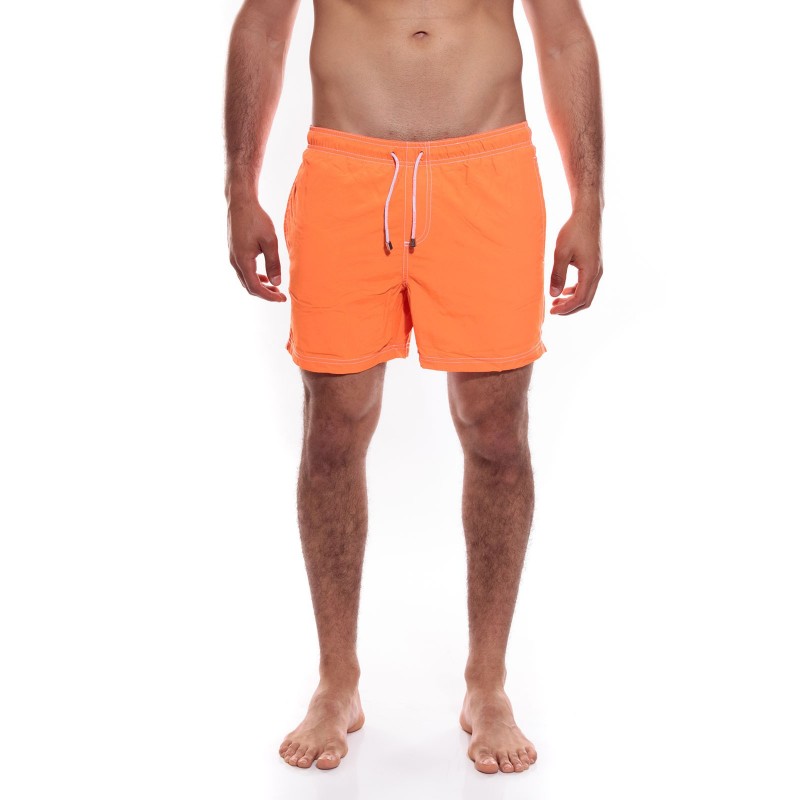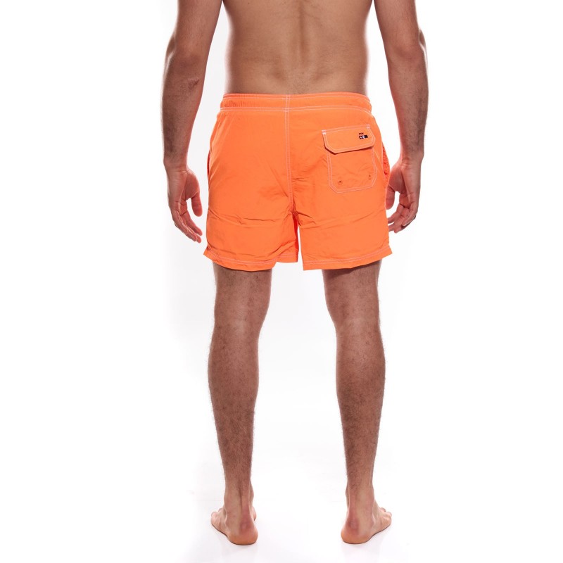 Short de bain uni. Très apprécié pour son séchage rapide. Taille élastiquée avec cordon de serrage extérieur. Slip intérieur en maille filet. 2 poches latérales et 1 poche arrière plaquée avec rabat à fermeture scratch et rivets de vidange. Surpiqûres apparentes. 100% polyamide. Lavage en machine à 30°.