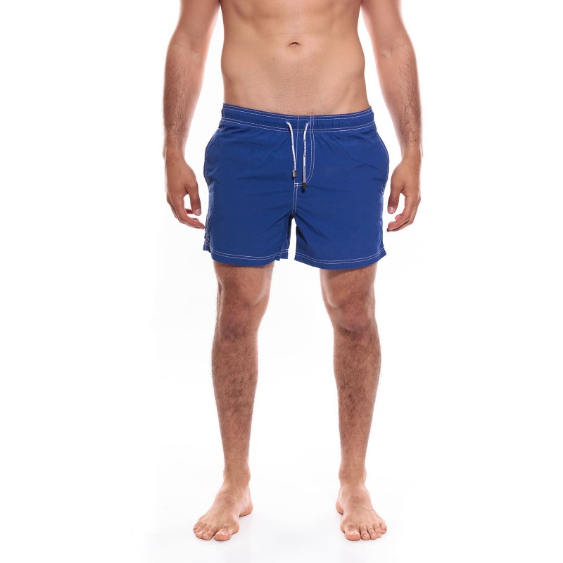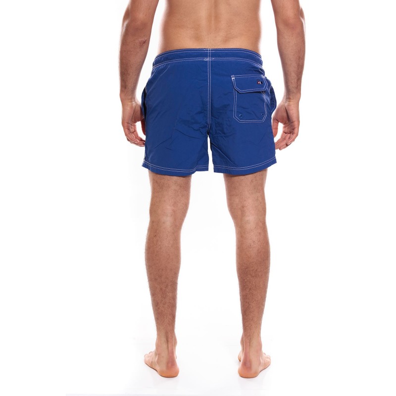 Short de bain uni. Très apprécié pour son séchage rapide. Taille élastiquée avec cordon de serrage extérieur. Slip intérieur en maille filet. 2 poches latérales et 1 poche arrière plaquée avec rabat à fermeture scratch et rivets de vidange. Surpiqûres apparentes. 100% polyamide. Lavage en machine à 30°.