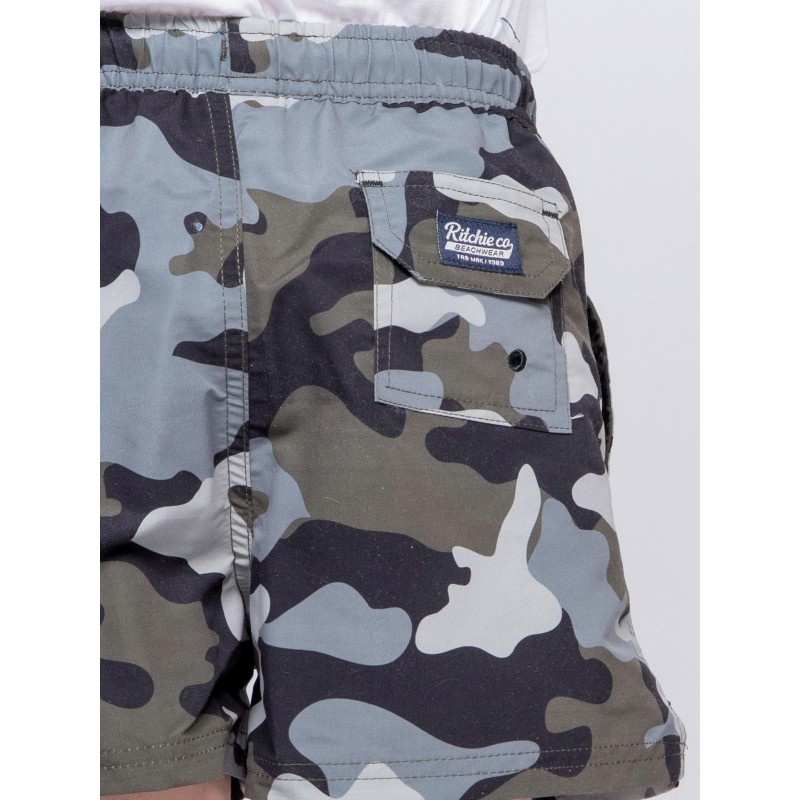 Maillot de bain à motif camouflage Ce short se décline en 2 coloris. Détails produit Taille élastiquée Fermeture par cordon de serrage 2 poches ouvertes 1 poche arrière passepoilée avec écusson Ritchie beachwear Slip intérieur... En savoir plus >