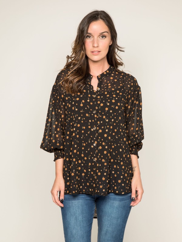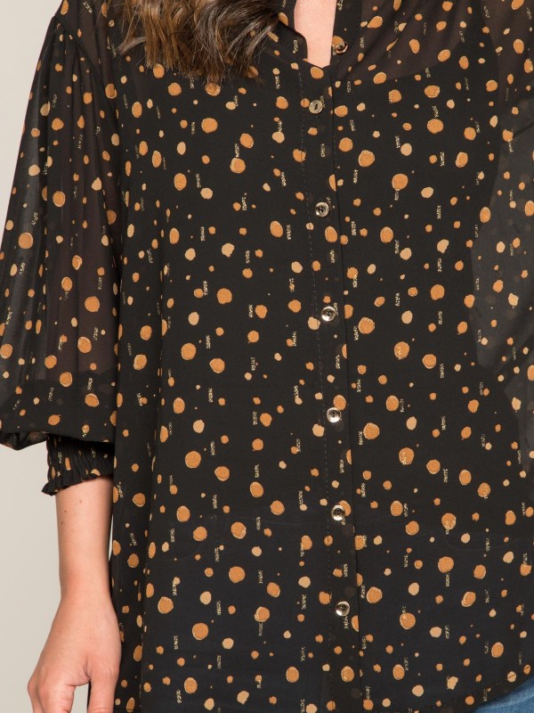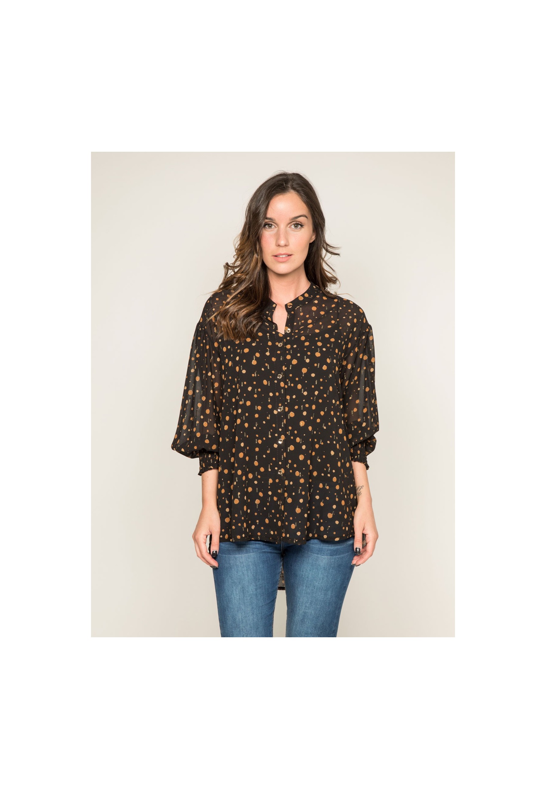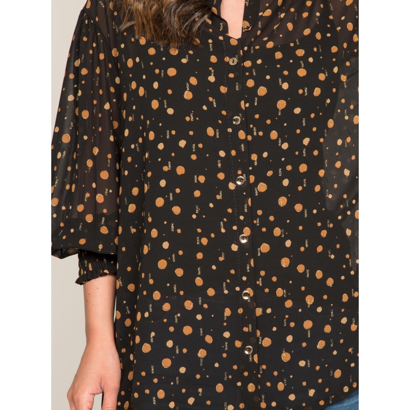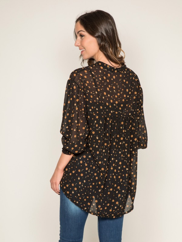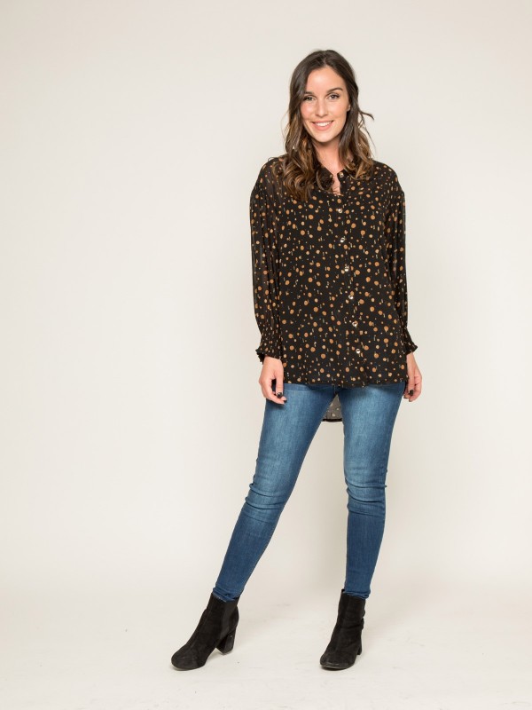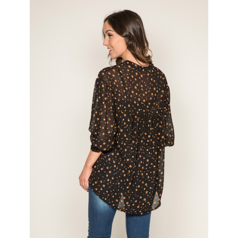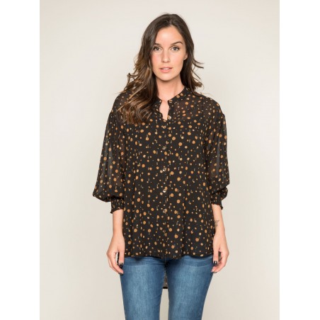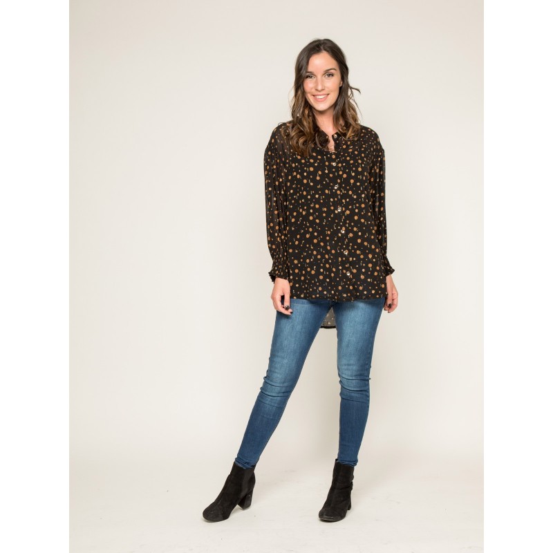 Légère et élégante, cette chemise noire imprimée de tons marrons incarne l'esprit féminin et classieux de la nouvelle collection Dona Lisa. Sa coupe simple est mise en valeur par ses manches trois-quarts révélant un effet ballon qui allégera la silhouette. Révélez le potentiel de cette chemise légèrement transparente en la coordonnant avec un jean slim noir et des bottines à talon.