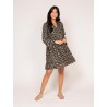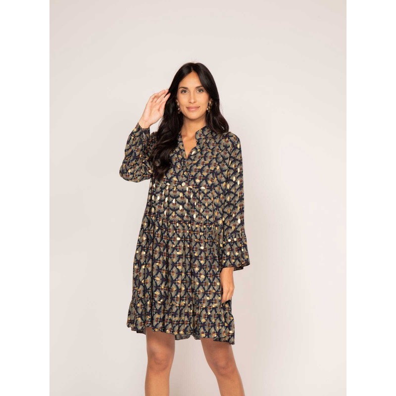 Cette robe Dona Lisa allie élégance et aisance, grâce à sa matière vaporeuse. Notre Maison crée un véritable jeu de volume à travers une encolure en pointe et de longues manches, qui se prolongent sur des poignets volantés. La pièce revêt un motif doré all-over, ainsi qu'un grand volant sur le bas, piles dans la tendance du moment. Habillez-vous en un clin d'il en accordant cette robe avec une paire de sandales.