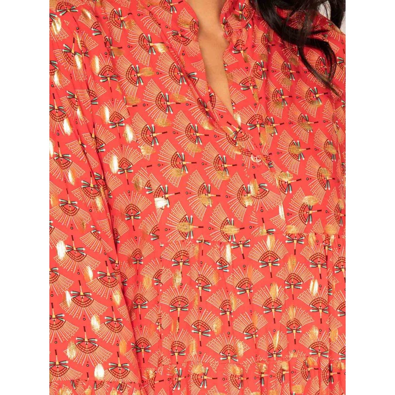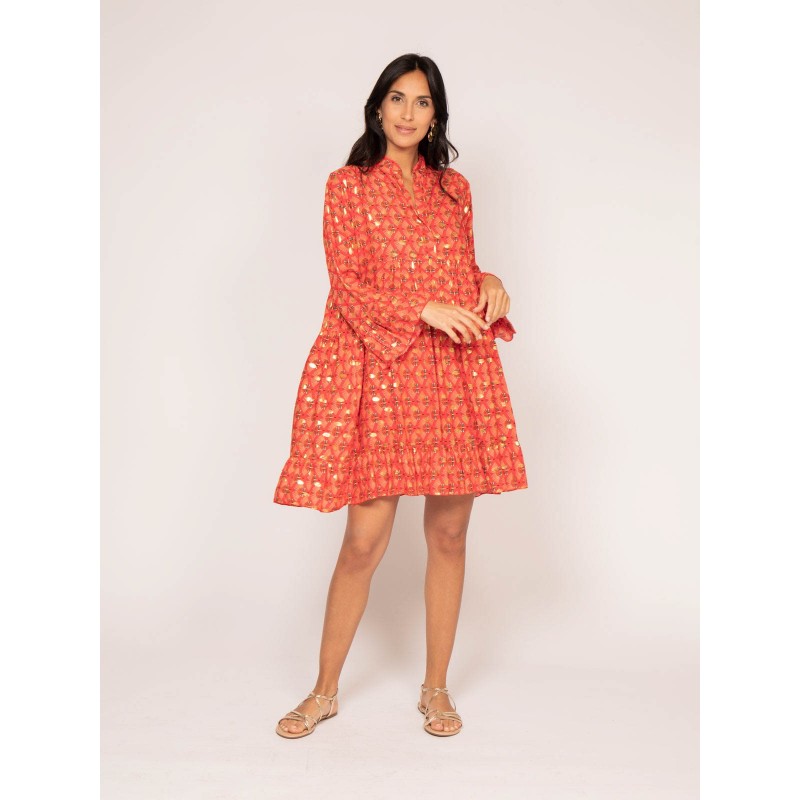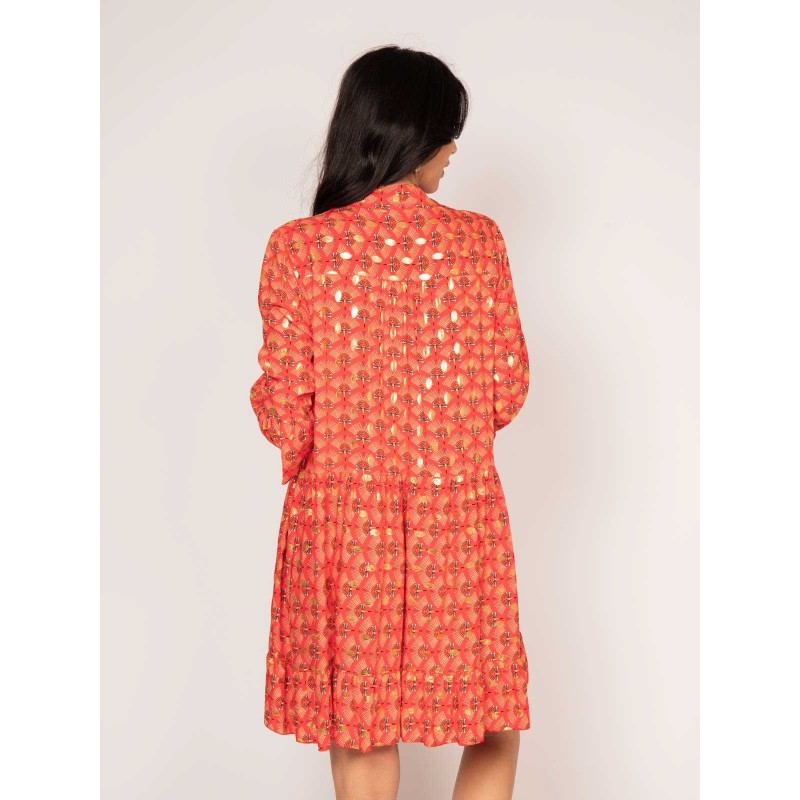 Cette robe Dona Lisa allie élégance et aisance, grâce à sa matière vaporeuse. Notre Maison crée un véritable jeu de volume à travers une encolure en pointe et de longues manches, qui se prolongent sur des poignets volantés. La pièce revêt un motif doré all-over, ainsi qu'un grand volant sur le bas, piles dans la tendance du moment. Habillez-vous en un clin d'il en accordant cette robe avec une paire de sandales.