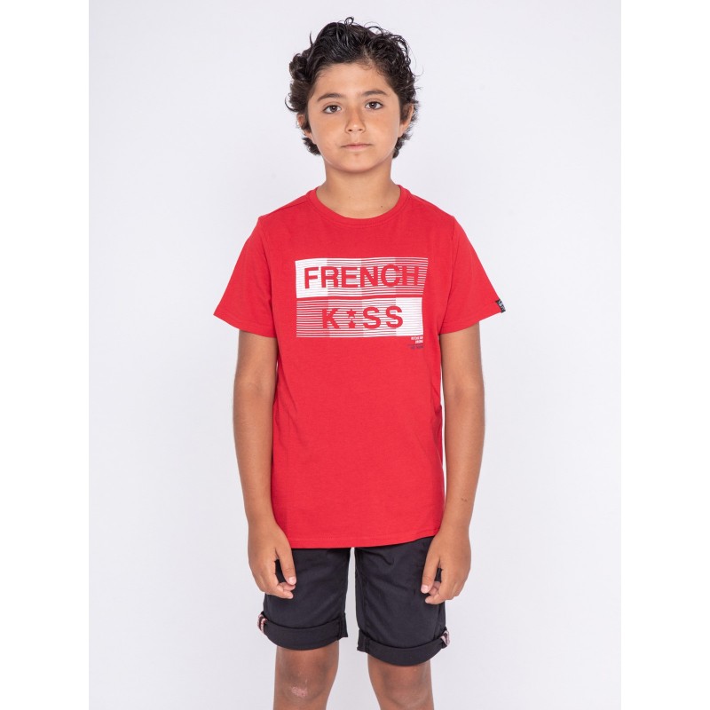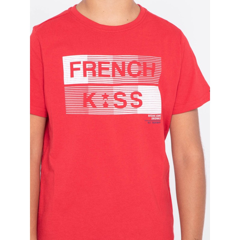 Ce tee shirt col rond Ritchie Jeans en coton léger et confortable se distingue par son inscription imprimée "french kiss" sur fond contrasté au motif rayé qui lui confère une touche graphique tendance.