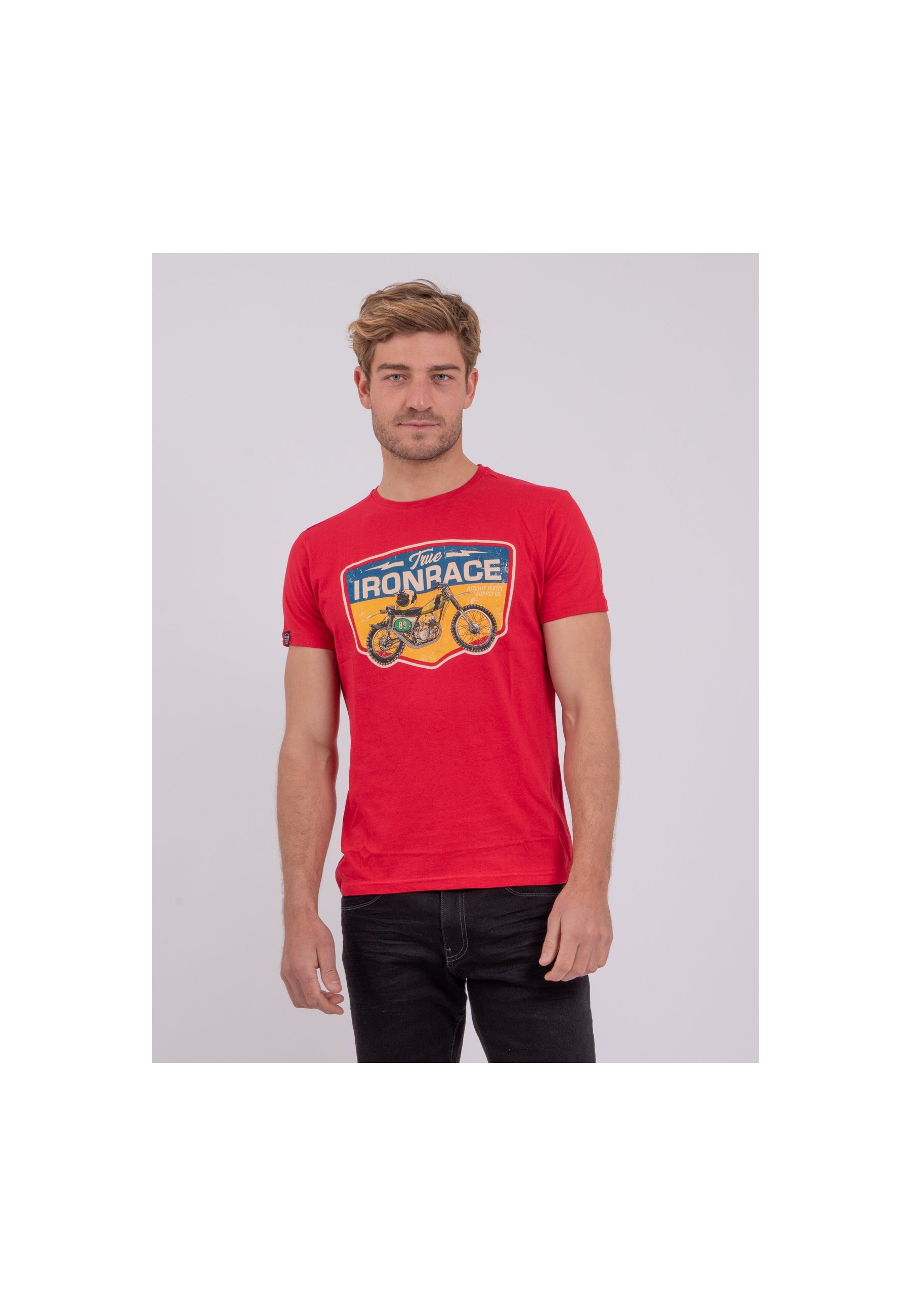Pour ce t-shirt en coton Ritchie Jeans, notre Maison s'inspire directement de l'univers biker. Imprimée sur la poitrine, une illustration vintage contrastée représente une moto sur fond coloré. Vous pourrez adopter un style casual en portant ce t-shirt pour homme avec un pantalon de ville en toile et une paire de tennis blanches.