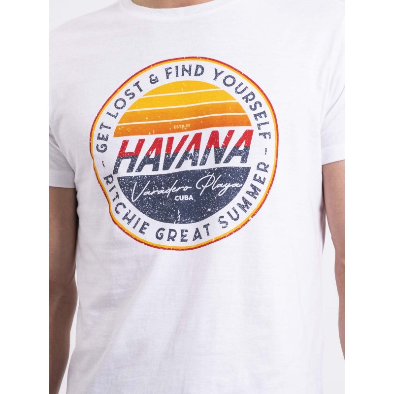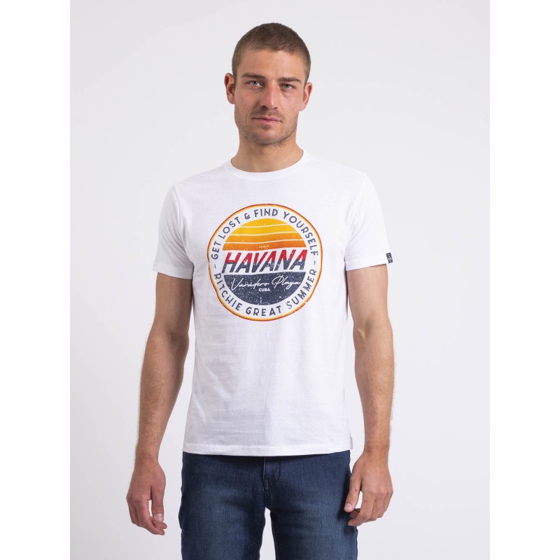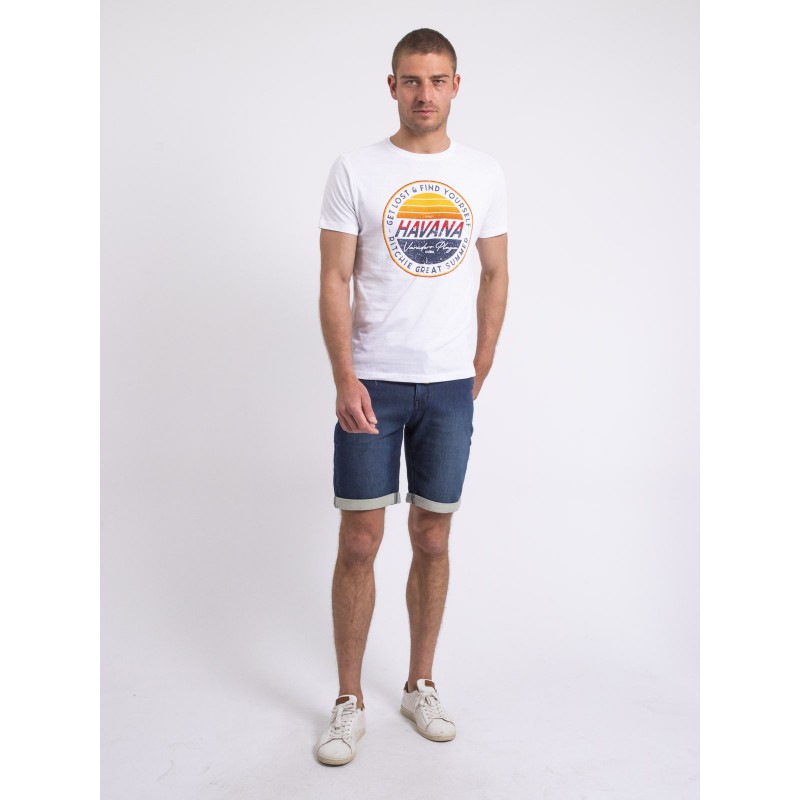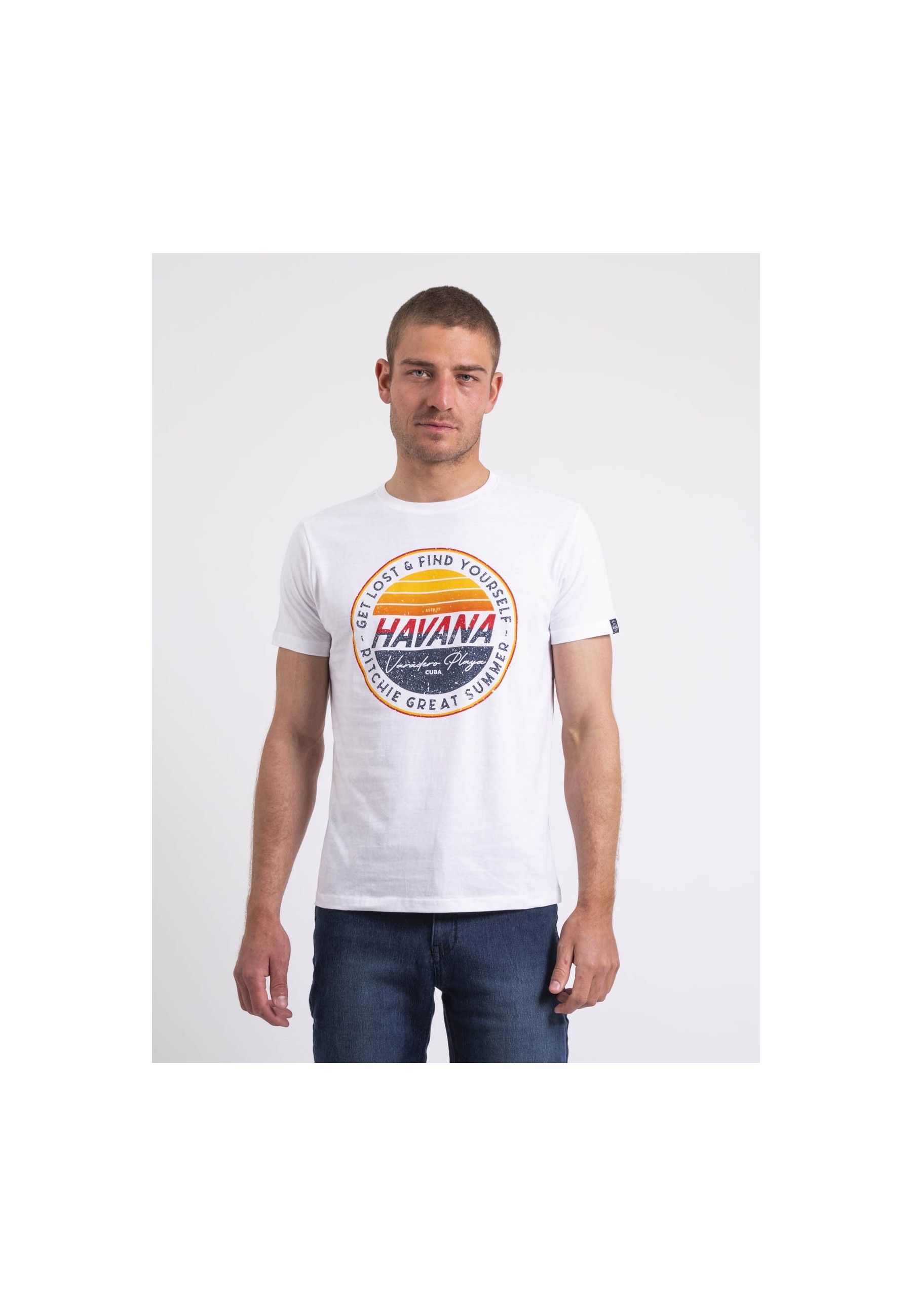 Ce tee shirt Ritchie Jeans se démarque par une sérigraphie vintage contrastée devant, pour un look tendance de saison. Coupe droite, col rond et manches courtes, il vous accompagnera tout l'été. Vous pourrez l'associer à un short et une chemise en denim de notre collection pour un total look casual.