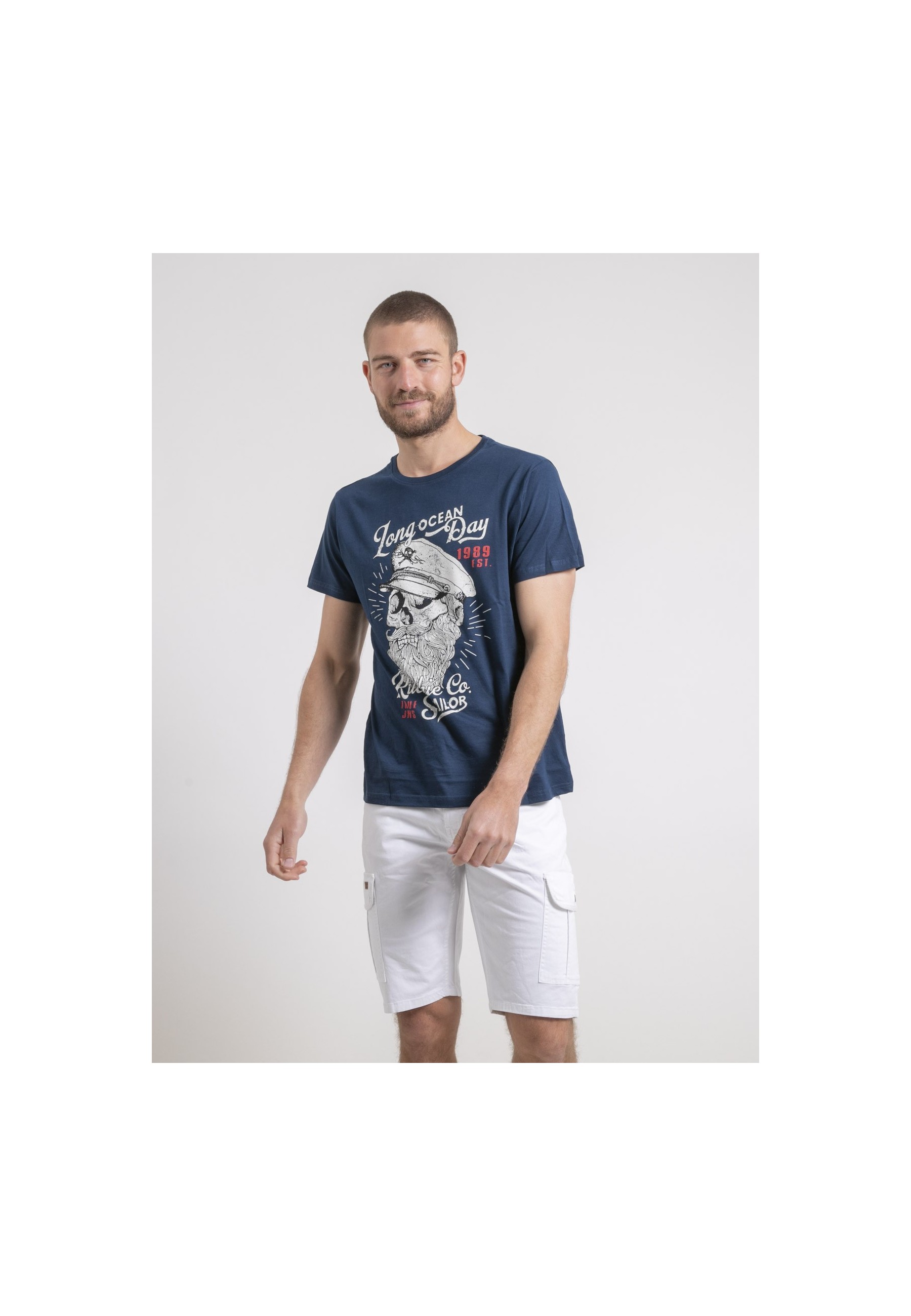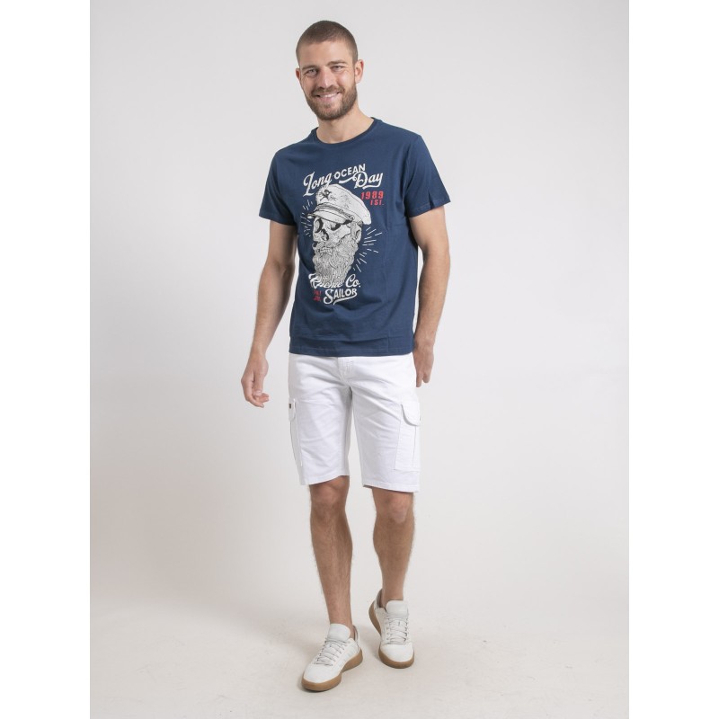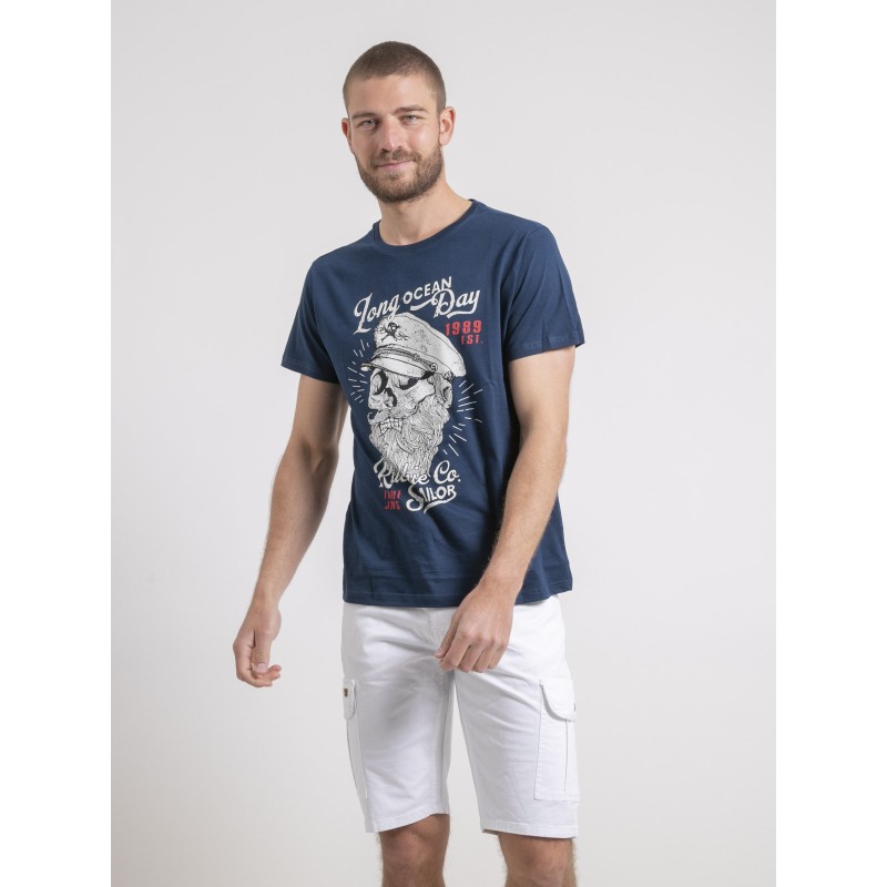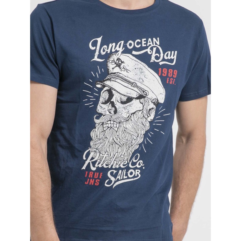 Ce tee shirt Ritchie jeans à manches courtes est confectionné en pur coton pour un porter fluide et confortable. Il se distingue par sa sérigraphie vintage inspirée du thème marin, pile dans la tendance du moment. Associez ce t-shirt homme à un bermuda pour un look estival parfait.