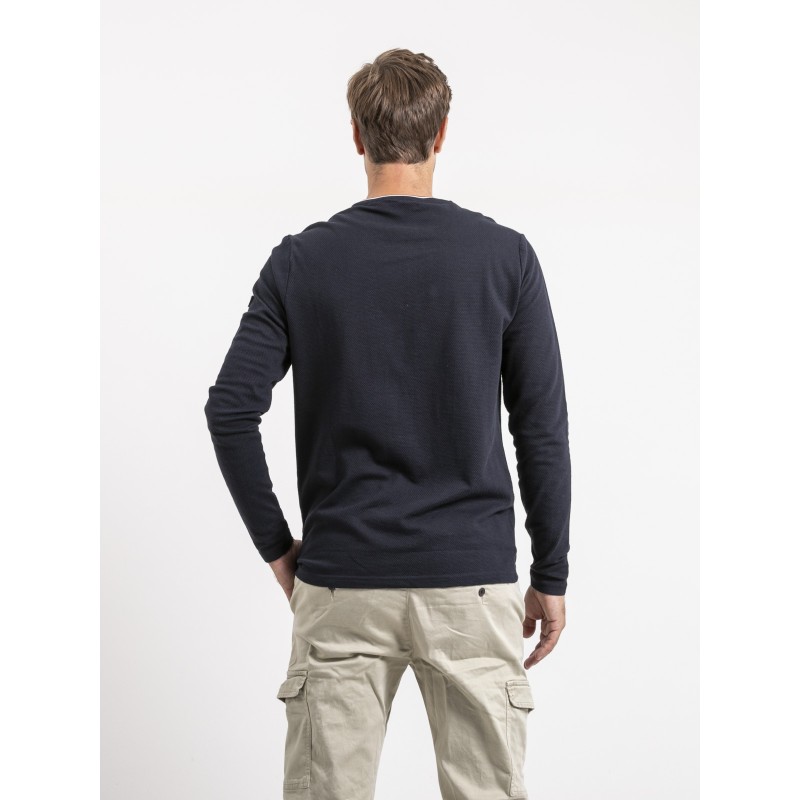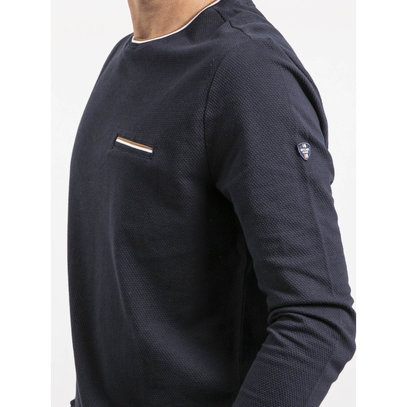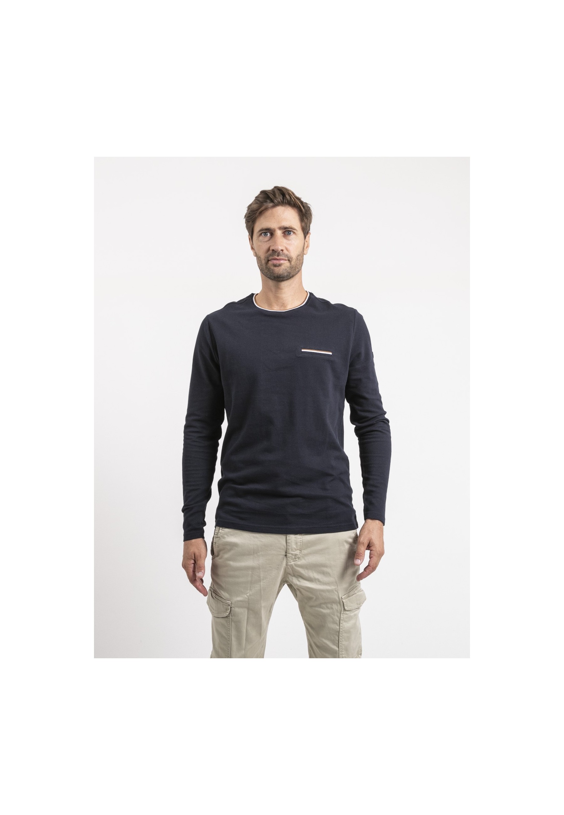 Ce t-shirt en pur coton maille est conçu pour offrir à la fois confort et style. Avec sa texture légèrement texturée et son détail raffiné de poche poitrine, il apporte une touche d'originalité discrète à votre tenue. Parfait pour un look casual ou plus habillé, ce t-shirt à manches longues s'associe facilement avec un pantalon cargo ou un jean pour une allure moderne et élégante. Sa coupe ajustée et son coloris marine en font un essentiel intemporel de votre dressing.
