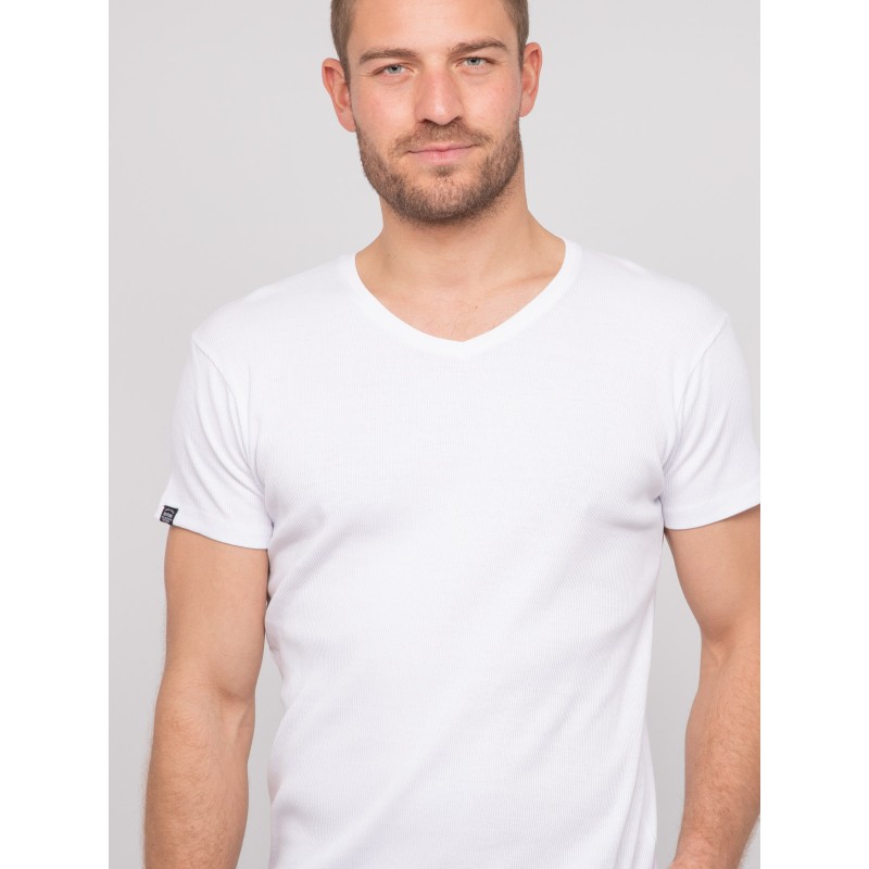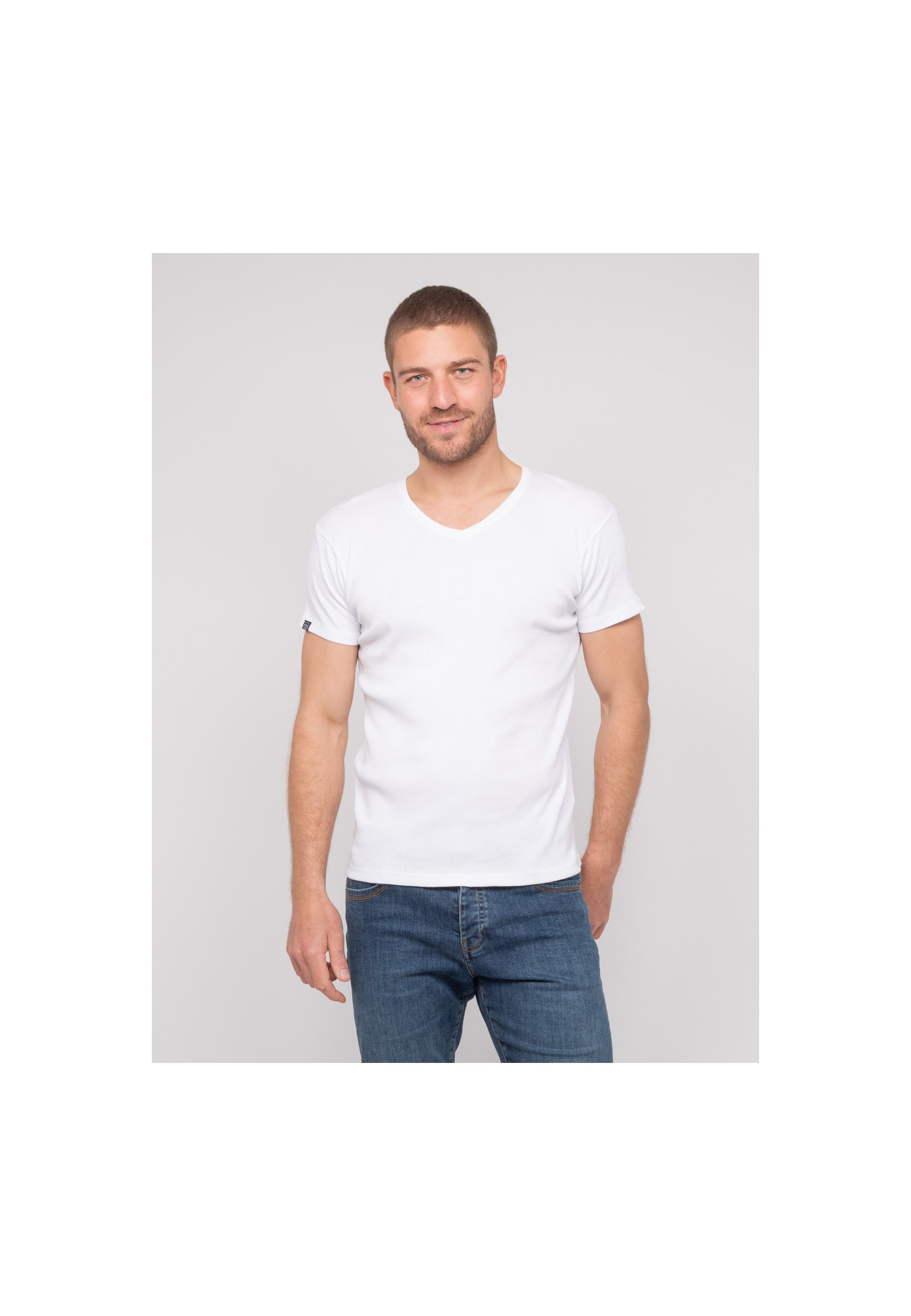 Détails produit Col V Manches courtes Coupe ajustée en coton extensible Maille côtelée Finition en fines cotes au Col et manches Étiquette siglée Ritchie cousue sur manche droite Composition et entretien 100% coton... En savoir plus >