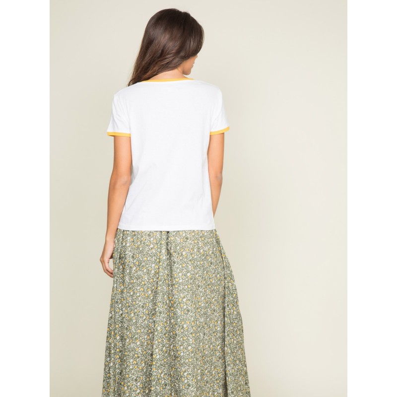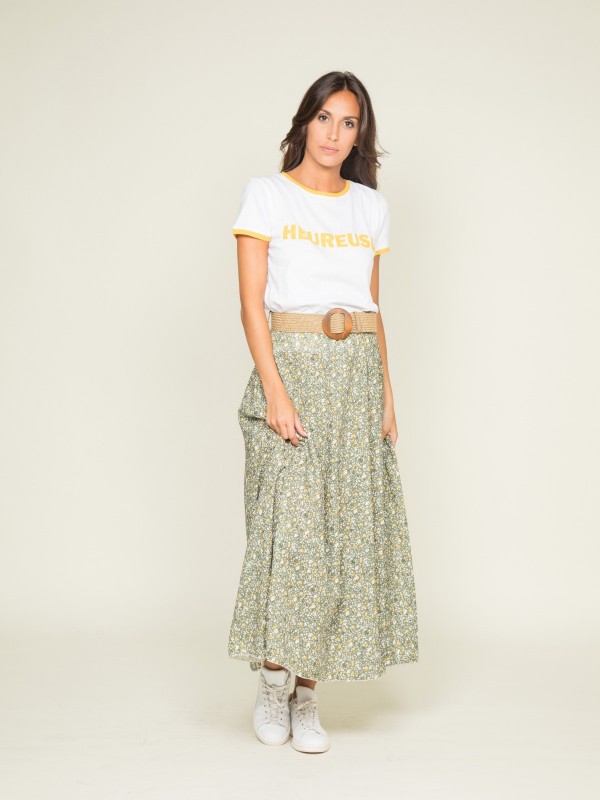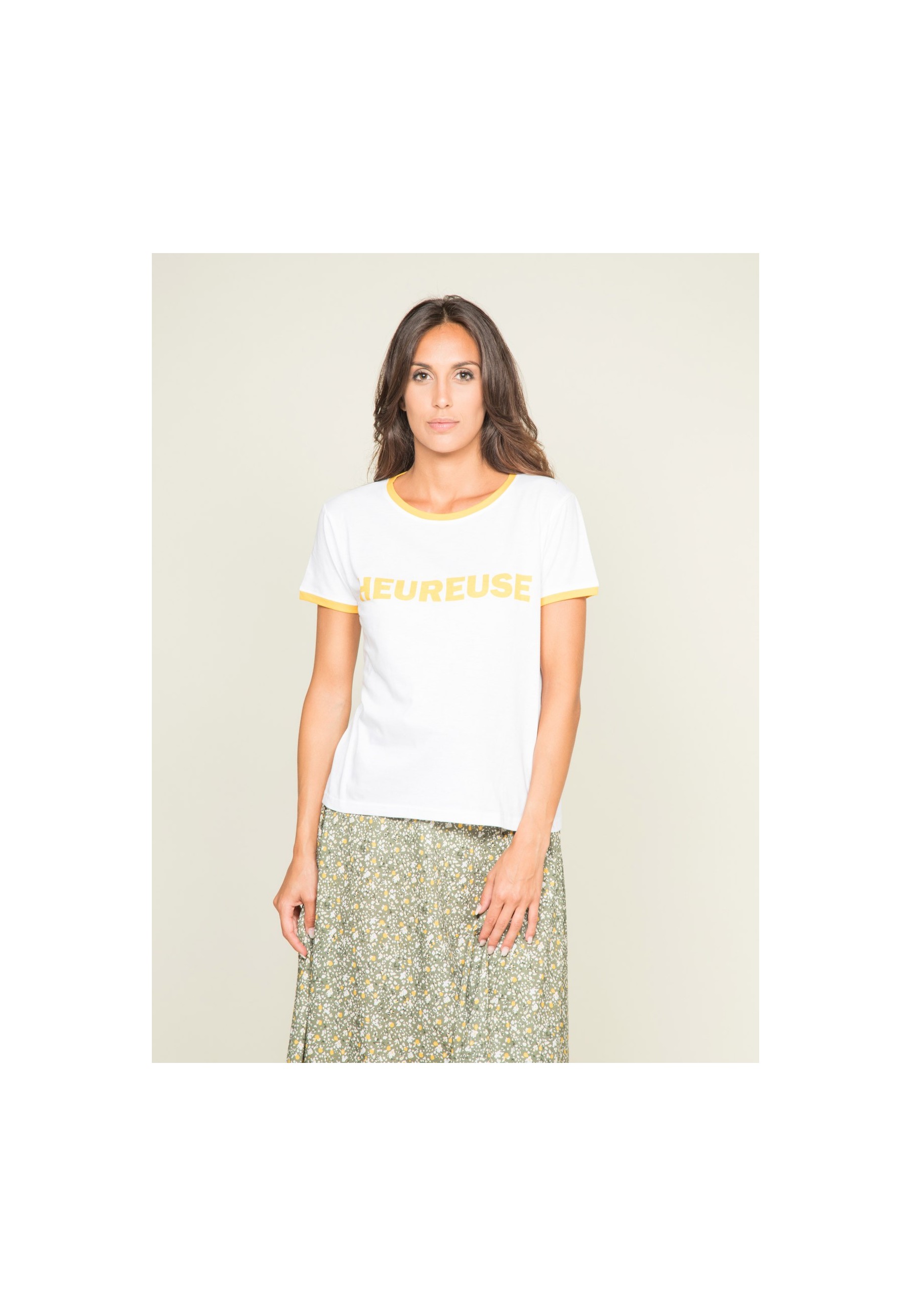 Ce tee shirt manches courtes Dona Lisa en pur coton se distingue par ses finitions et son inscription "heureuse" contrastantes pour une note féminine tendance et néanmoins sportswear. Associé à une jupe ou short en denim, ce T-shirt à la coupe droite apportera une note moderne à votre tenue.
