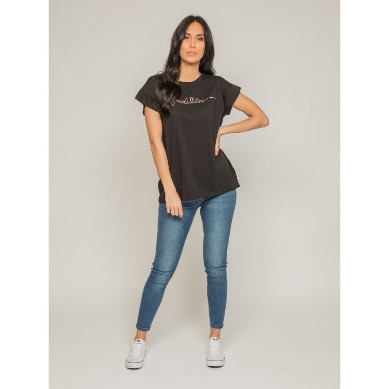 Ce T-shirt Dona Lisa séduit par son allure sporty chic. Le vêtement opte pour une coupe courte, avec manches courte et col rond, et de larges bords-côtes. On note le message coloré "good vibes" et le toucher presque soyeux qui confèrent de la féminité à cette pièce sportive. Un top idéal sur un jean. Détails produit Manches courtes Col rond Message contrastant Coupe droite Composition et entretien 60% coton, 40% polyester Lavage en machine à 30° Conseils taille Le mannequin mesure 172 cm et porte l'article en taille S