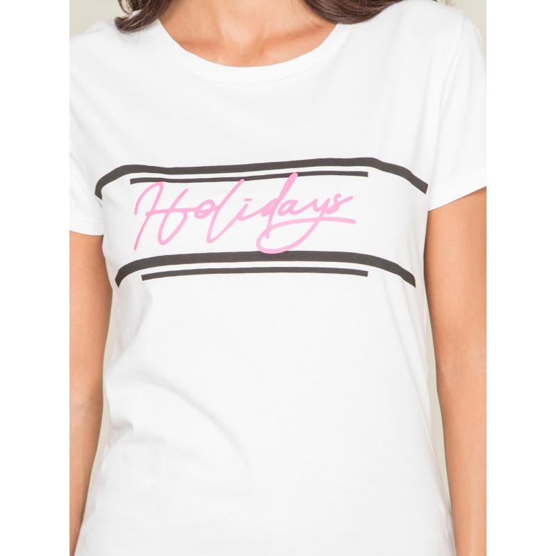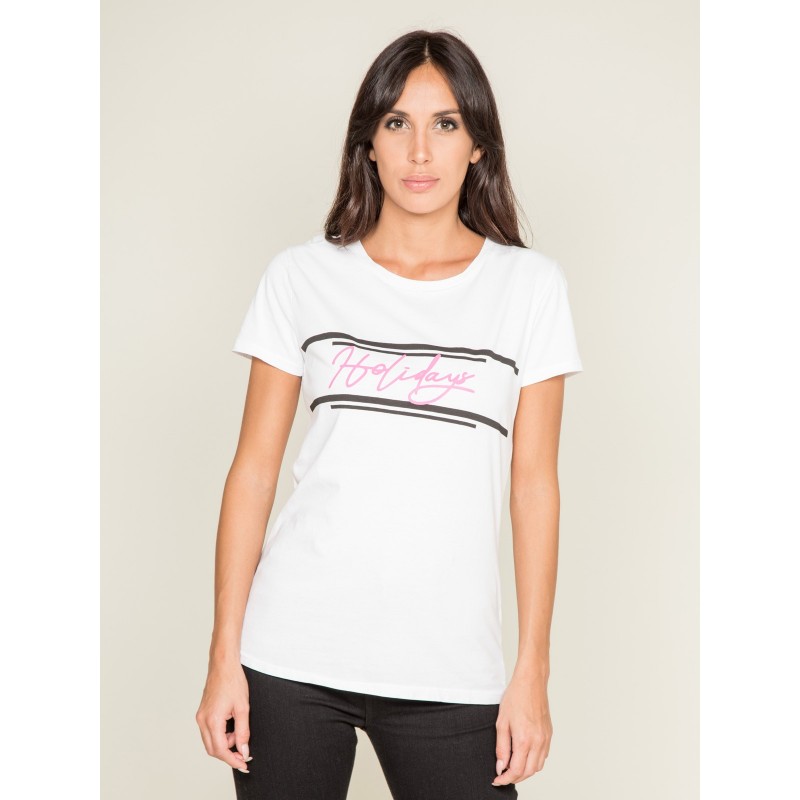 Pour un look fun et féminin, adoptez ce tee-shirt Dona Lisa et son inscription à l'avant "HOLIDAYS". Vous pourrez le porter avec notre pantalon à motifs ELIMA pour un style pile dans la tendance du moment.