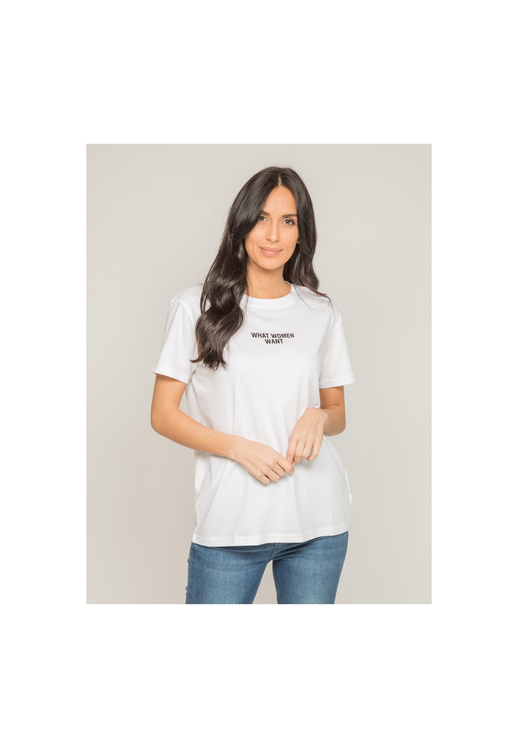 Adoptez ce tee-shirt Dona Lisa au look minimaliste et son inscription "WHAT WOMEN WANT". Vous pourrez l'associer à un pantalon en denim tel que notre jean mom fit EDONIS pour une silhouette parfaite.