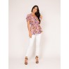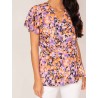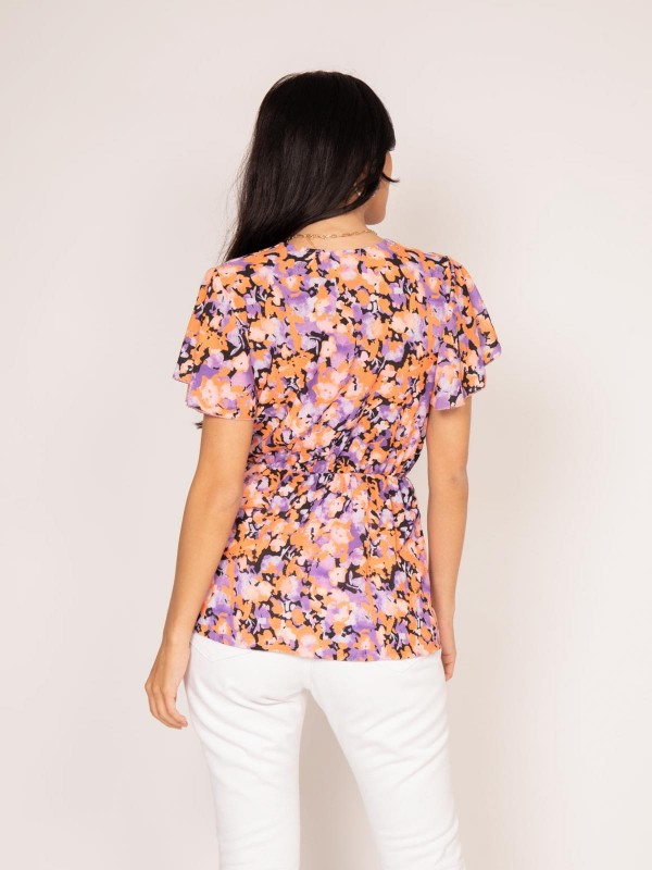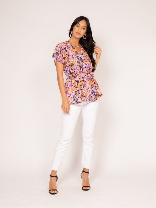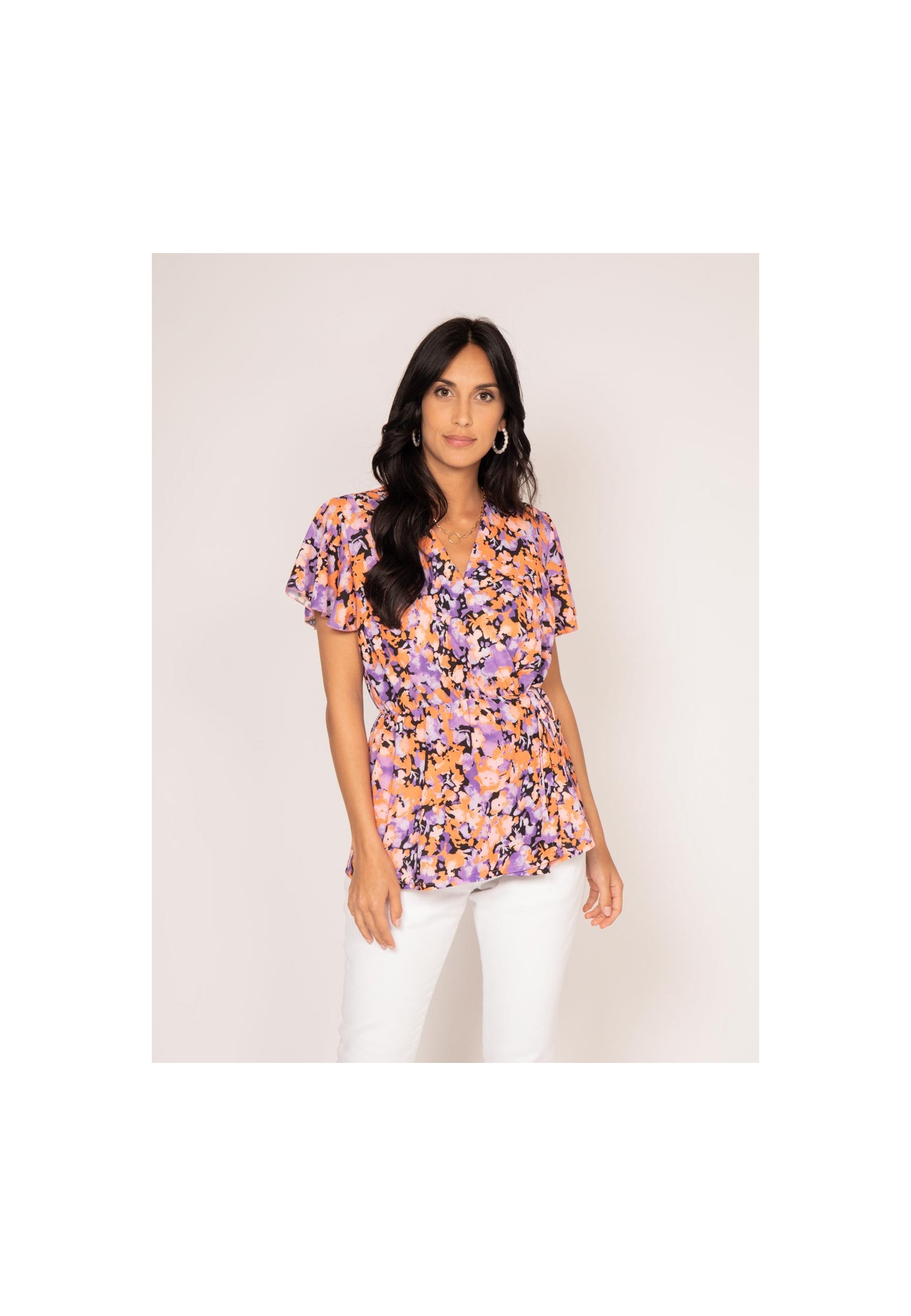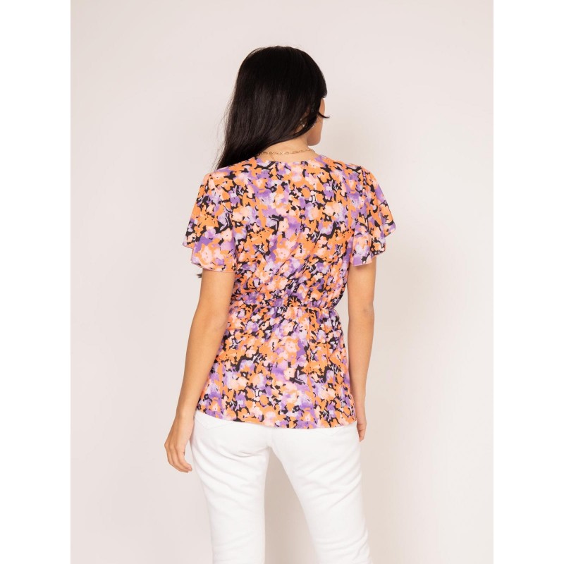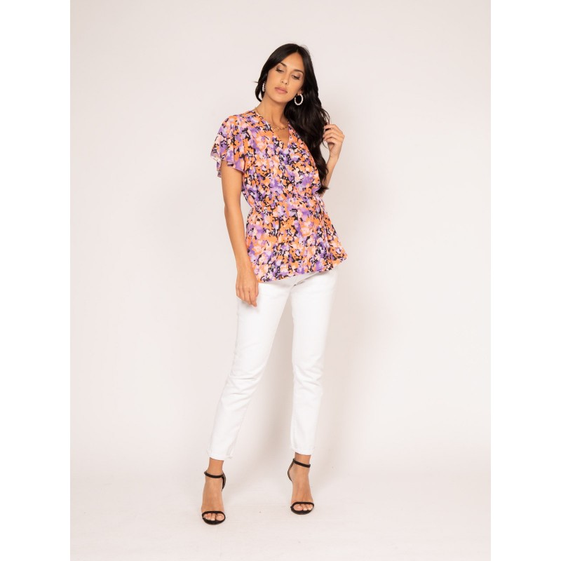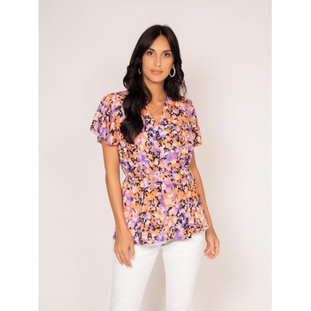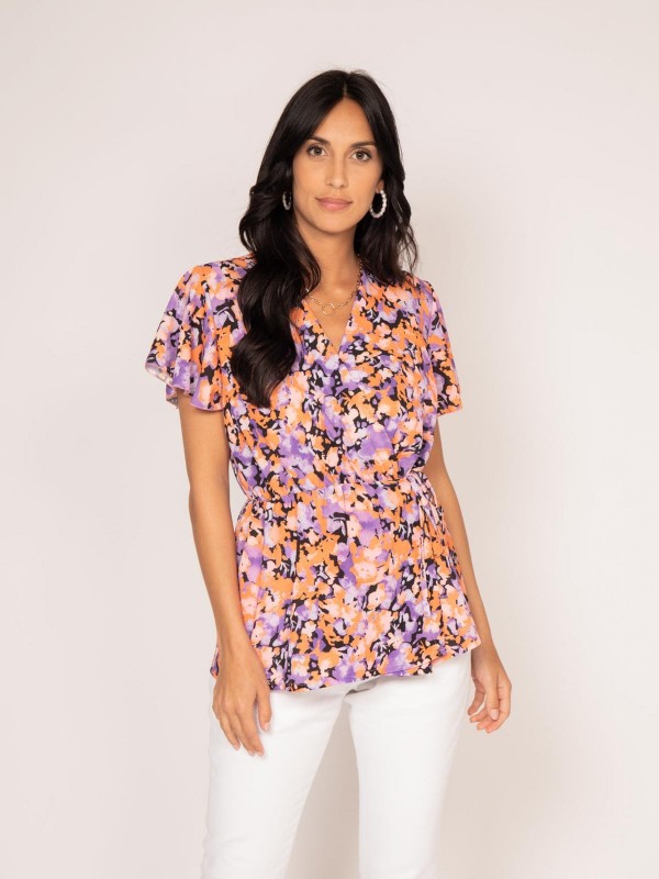 Ce top violet imprimé Dona Lisa offre une parfaite transition entre l'été et la demi-saison, grâce à son étoffe particulièrement fluide. Sa coupe portefeuille décolletée met le buste en valeur, tandis que de grands volants viennent agrémenter ses manches courtes. Décliné sur toute la surface, notre motif fleuri présente des tons orangés qui illumineront vos tenues les plus simples. Combinez notamment ce top pour femme avec une jupe courte en denim bleu et un foulard noué autour du cou.