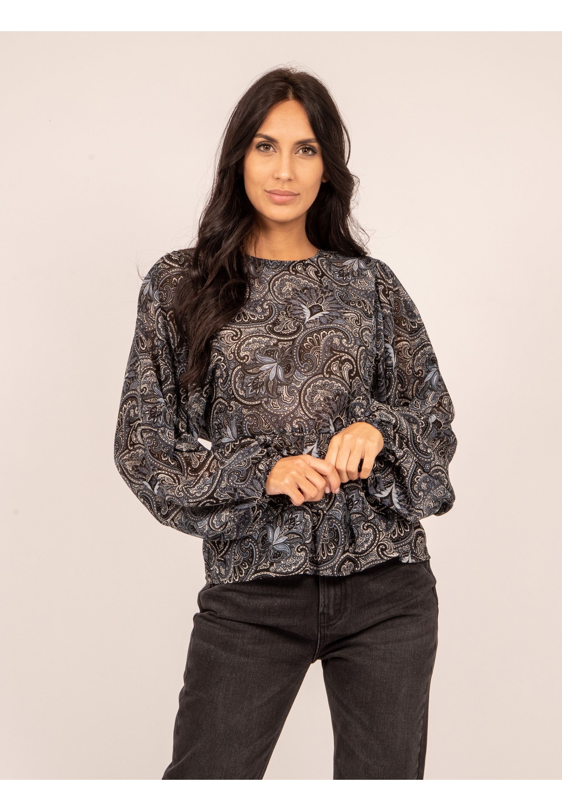Ce top à manches longues Dona Lisa se distingue par ses manches bouffantes resserrées aux poignets et son col rond, qui lui confèrent une allure sophistiquée et féminine. Le motif cachemire créera des nuances en jouant avec la transparence... En savoir plus >