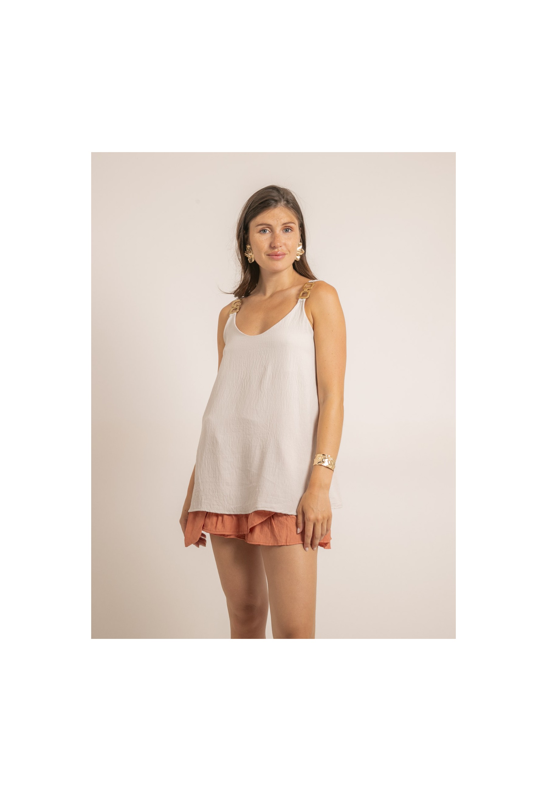 Ce top fluide et sophistiqué est un incontournable de la saison. Sa coupe ample et aérienne, rehaussée par des bretelles ornées de maillons dorés, offre une touche d'élégance décontractée. Idéal pour sublimer vos tenues estivales avec style et confort.
