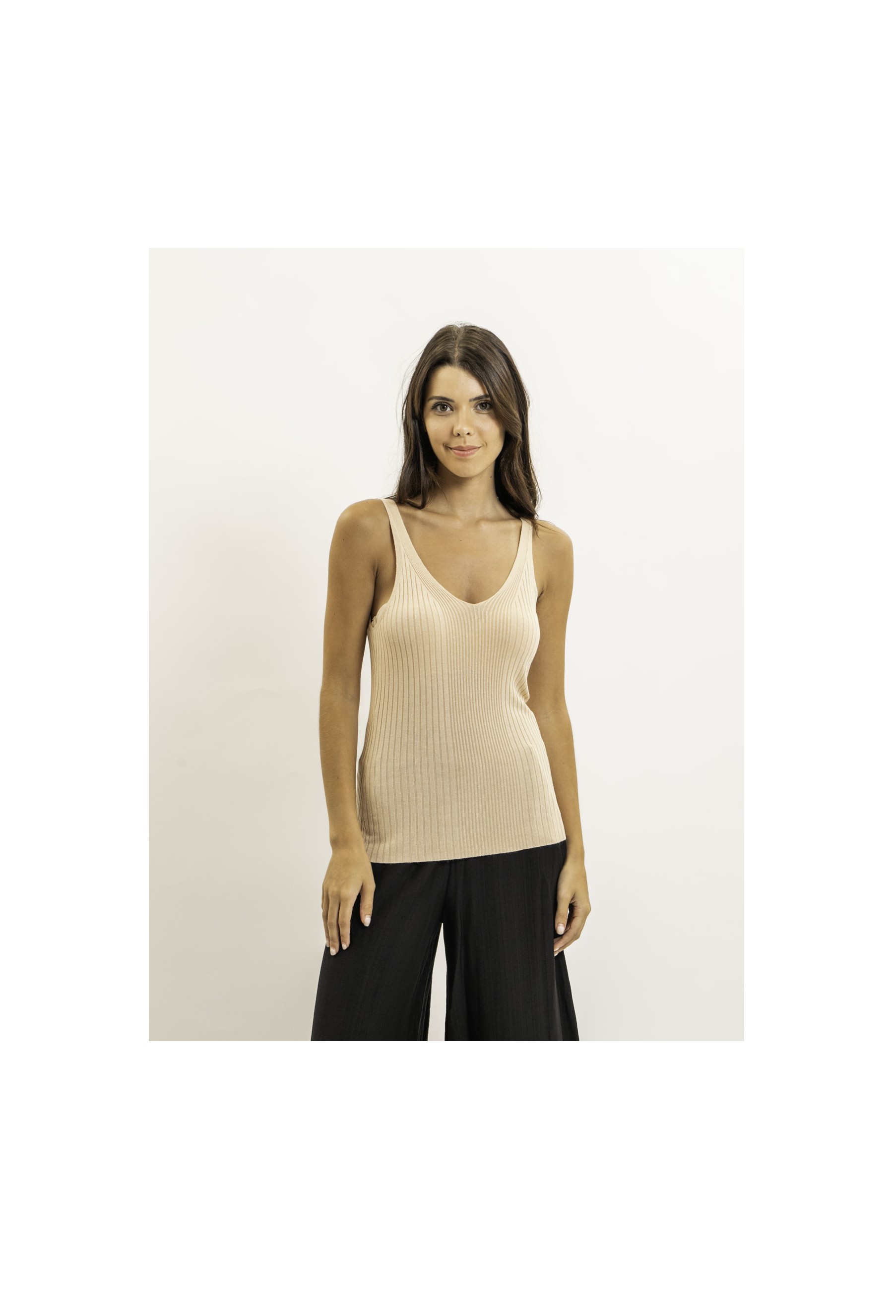 Ce débardeur côtelé et extensible est un basique chic et intemporel. Sa coupe près du corps et son col en V mettent subtilement en valeur la silhouette. Une pièce essentielle à porter seule ou en superposition pour un style polyvalent.