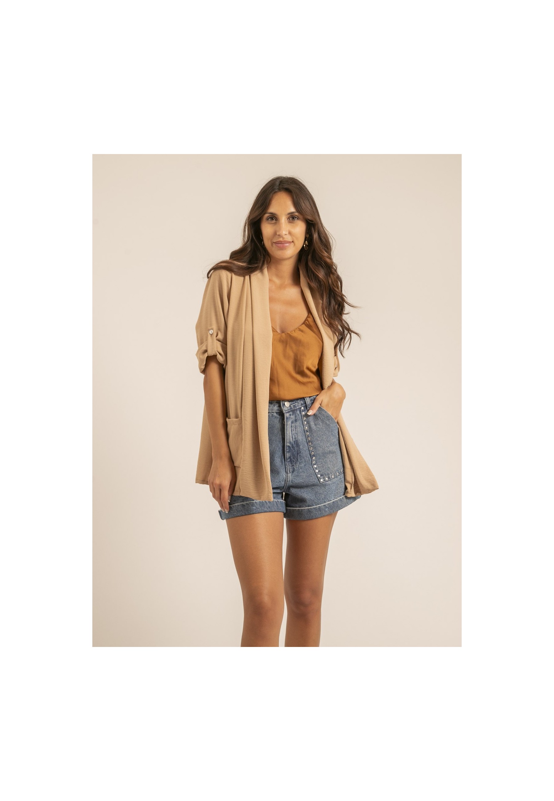 Cette veste Dona Lisa offre une interprétation originale de la veste de smoking, pour mieux se distinguer au quotidien. Confectionnée dans un tissu fluide, sa coupe droite ouverte et son col châle lui insufflent du raffinement, tandis que deux poches plaquées s'invitent dans le bas. Harmonisez cette veste légère avec un pantalon en jean pour un ensemble féminin et tendance.